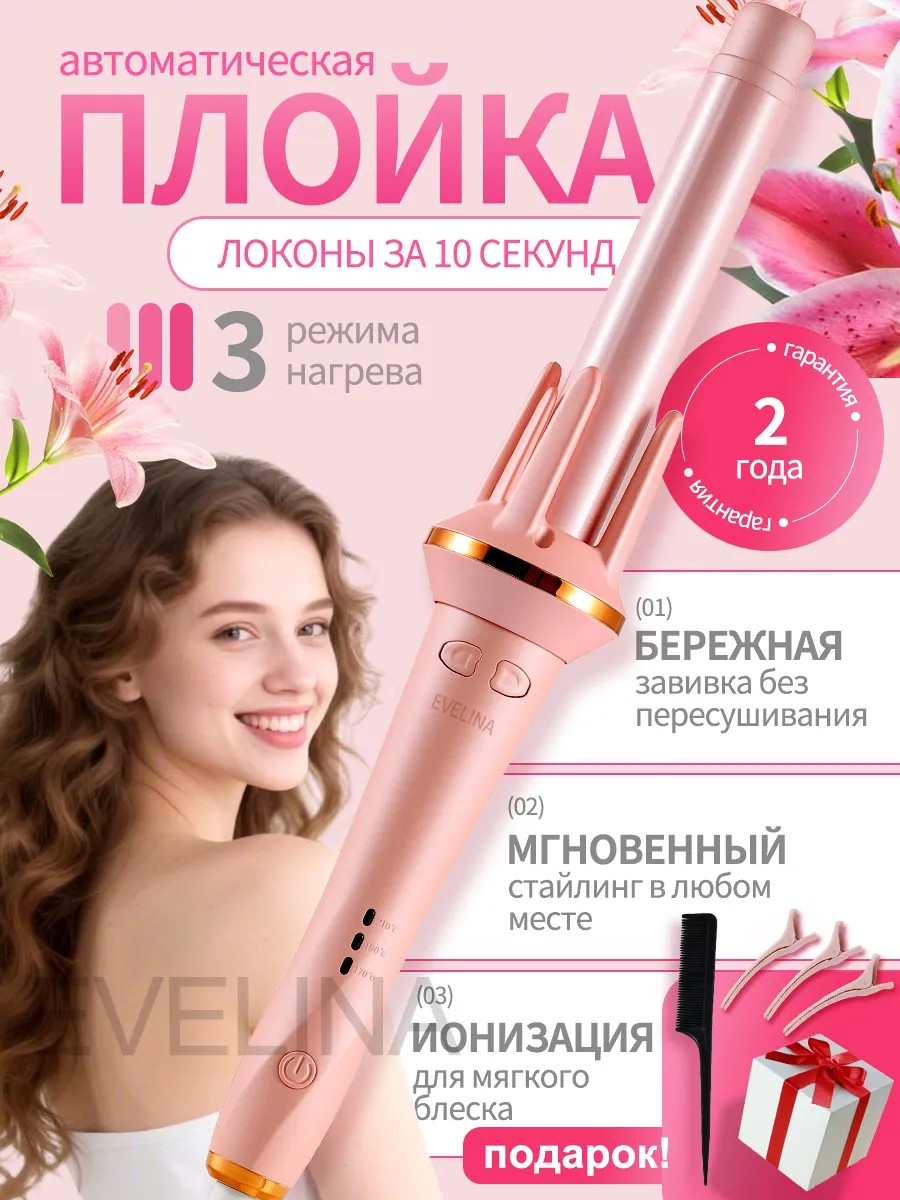 Плойка EVELINA– это автоматическая плойка для завивки кудрей и укладки волос, инновационный инструмент, который позволяет вам с легкостью создавать идеальные кудри с минимальными усилиями.