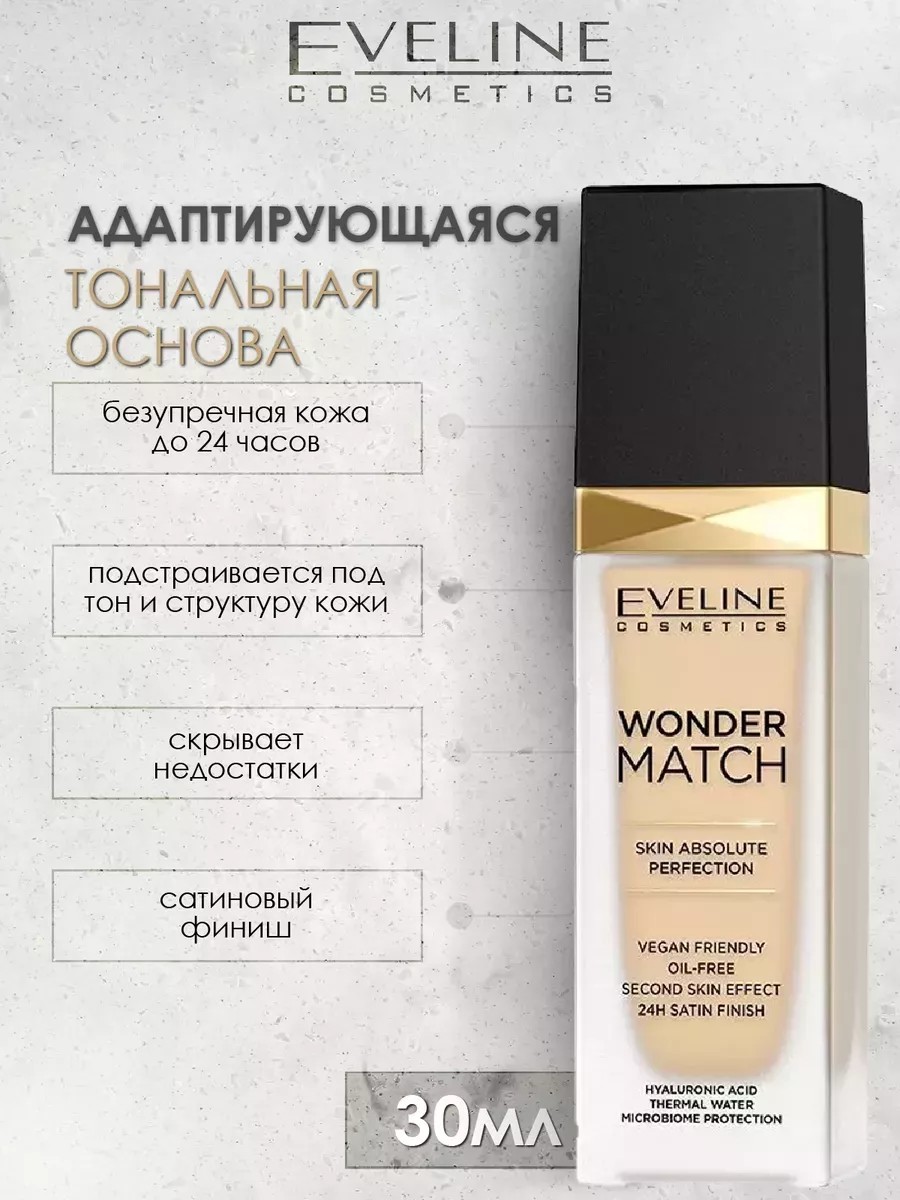 Тональный крем Eveline обеспечивает безупречное завершение макияжа в любом свете благодаря инновационной технологии, которая также гарантирует стойкий цвет лица на протяжении 24 часов. Состав тональной основы включает термальную воду, экстракт асаи и гиалуроновую кислоту, которые питают, увлажняют и защищают кожу, придавая ей гладкость и эластичность уже через десять дней. Тональное средство также обеспечивает защиту кожи от воздействия окружающей среды, сохраняя ее здоровой и увлажненной.