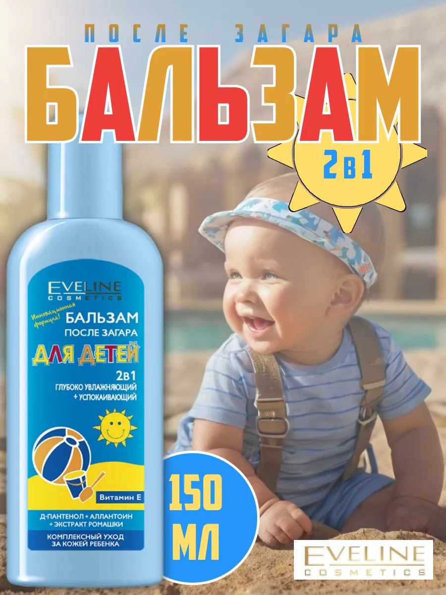 Бальзам после загара для детей 2В1, 150Мл эвелин разработан специально с учетом особенностей нежной кожи малыша. Его мягкая формула бережно успокаивает, увлажняет и смягчает кожный покров ребенка. Входящие в состав бальзама компоненты помогают защитить эпидермис от потери влаги и шелушения. Д-пантенол интенсивно снимает воспаление и раздражение кожи, способствует быстрому заживлению солнечных ожогов. Аллантоин обладает высокими увлажняющими свойствами и улучшает эластичность кожи, а натуральное масло ромашки всем известно своими противовоспалительными и успокаивающими свойствами.