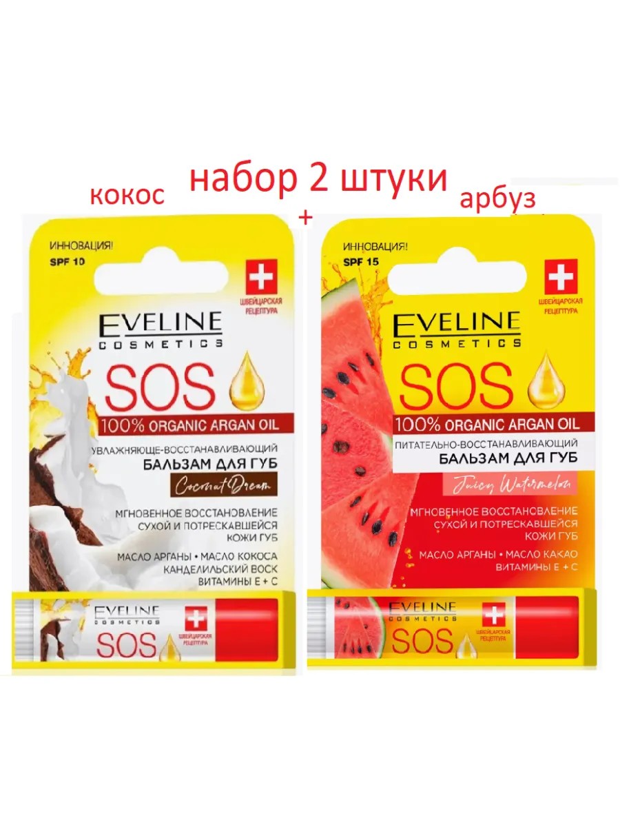 EVELINE Бальзам для губ КОКОС+АРБУЗ ARGAN OIL SOS - 2 штуки