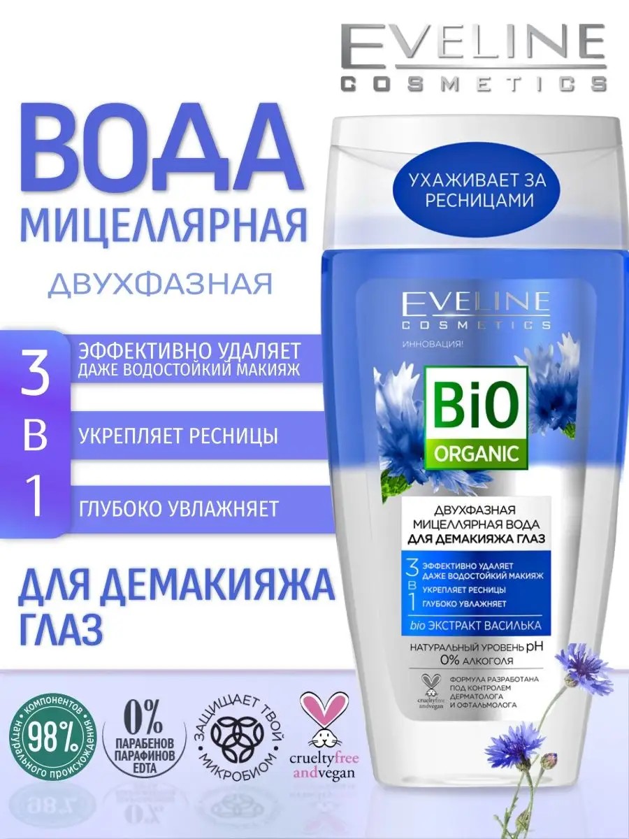 Двухфазная мицеллярная вода для демакияжа глаз Bio organic 3в1 с экстрактом василька эффективно снимает даже водостойкий макияж, бережно ухаживает за ресницами, не оставляя жирной пленки.