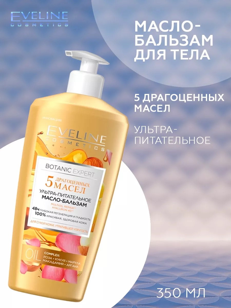 Масло-бальзам 5 Драгоценных масел Botanic Expert от EVELINE. Уникальная формула body glow придает коже эластичность и восстанавливает ее естественный блеск. Высокая концентрация ценных растительных масел: розовое масло, масло макадамии, аргановое масло, масло марулы, масло кукуи обеспечивает интенсивное увлажнение и глубокую регенерацию кожи. Натуральный растительный комплекс MULTI OIL REPAIR (ратания, какао) придает коже красивый и здоровый оттенок. Уже после 1-го применения кожа приобретает невероятную упругость и гладкость. Лёгкая консистенция масла-бальзама легко наносится и быстро впитывается, не оставляя жирной пленки.