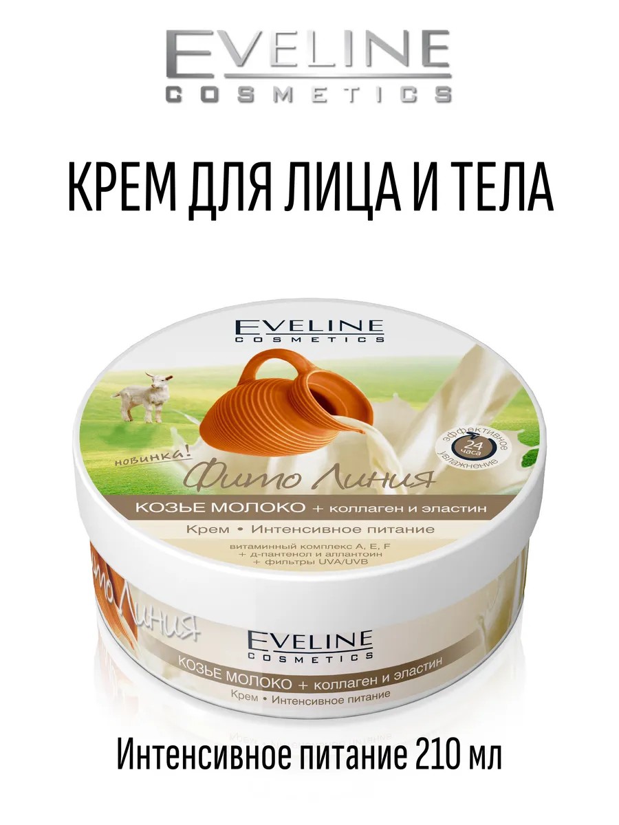 Eveline крем для тела питательный Фито линия на основе козьего молока, коллагена и эластина моментально и эффективно увлажняет, устраняет ощущение стянутости, придает коже шелковистую гладкость, а также активизирует производство натурального коллагена. Нежный крем Eveline для тела для сухой кожи это универсальный продукт, призванный ухаживать за кожей всех типов, чтобы обеспечивать интенсивное питание вместе с эффективным увлажнением на протяжении 24-х часов! Eveline Фито линия увлажнение для тела отличается приятным ненавязчивым ароматом и нежной кремовой консистенцией, которая быстро впитывается и не доставляет никакого дискомфорта. Сочетание козьего молока, эластина и коллагена, масла авокадо и витаминного комплекса обусловило великолепные свойства крема Eveline. Он насыщает каждую клеточку живительной влагой и полезными веществами, избавляя кожу от стянутости и придавая шелковистую гладкость, оказывает укрепляющее и восстанавливающее, антиоксидантное и регенерирующее действия. Благодаря фильтрам UVA/UVB крем для тела увлажняющий для сухой кожи оберегает от воздействия ультрафиолета. Крем питательный для тела предупреждает возникновение сухости и раздражения, создавая превосходный омолаживающий эффект, данное средство позволяет своей обладательнице поддерживать кожу в идеальном состоянии!