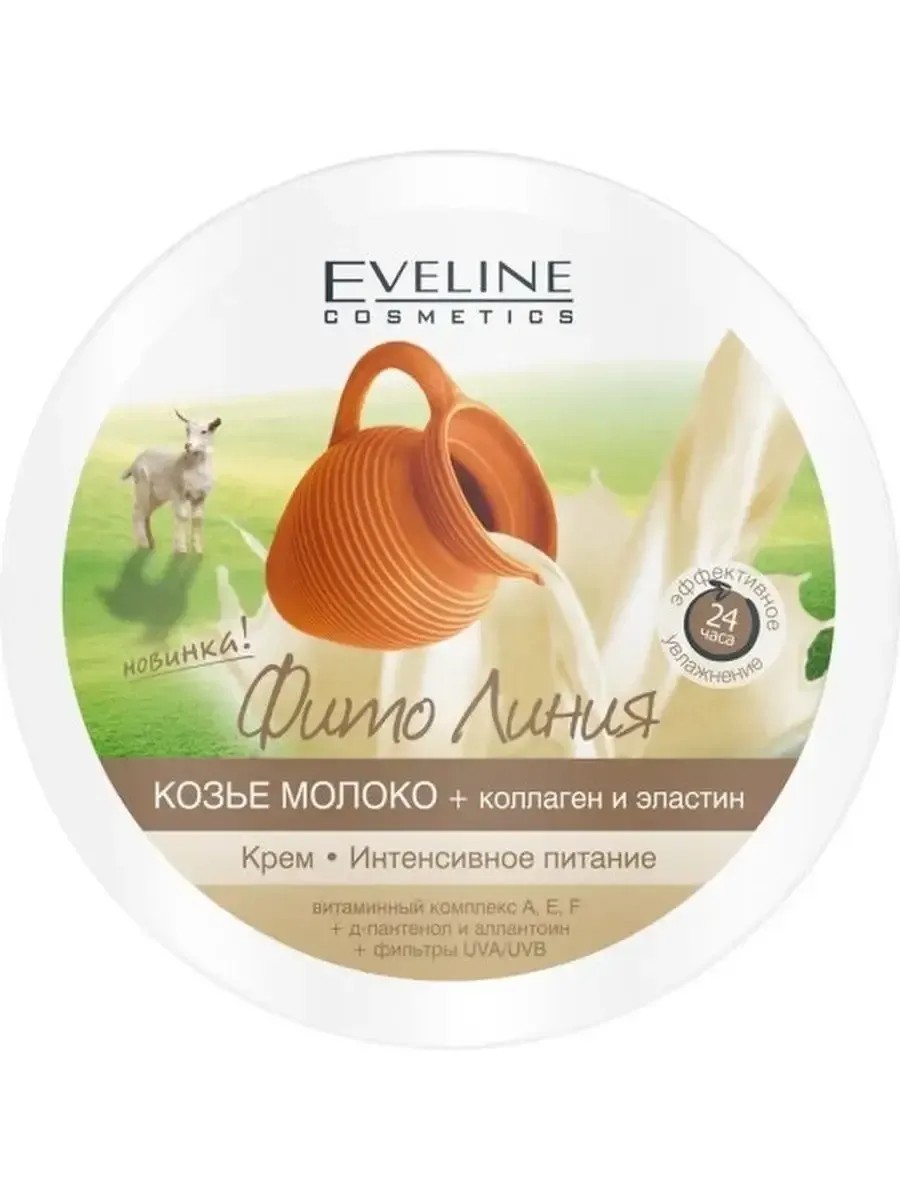 Eveline Фито линия Крем интенсивное питание козье молоко+коллаген и эластин, 210мл.В формулу крема входят козье молоко, масло авокадо, витамины A, E, F, D-пантенол и аллантоин. Козье молоко активизирует обменные процессы в клетках кожи, оказывает заживляющее и восстанавливающее действие, поддерживает защитные функции эпидермиса, дарит коже естественную упругость и эластичность. Коллаген и эластин способствуют восстановлению клеток эпидермиса, предотвращают потерю эластичности и упругости.