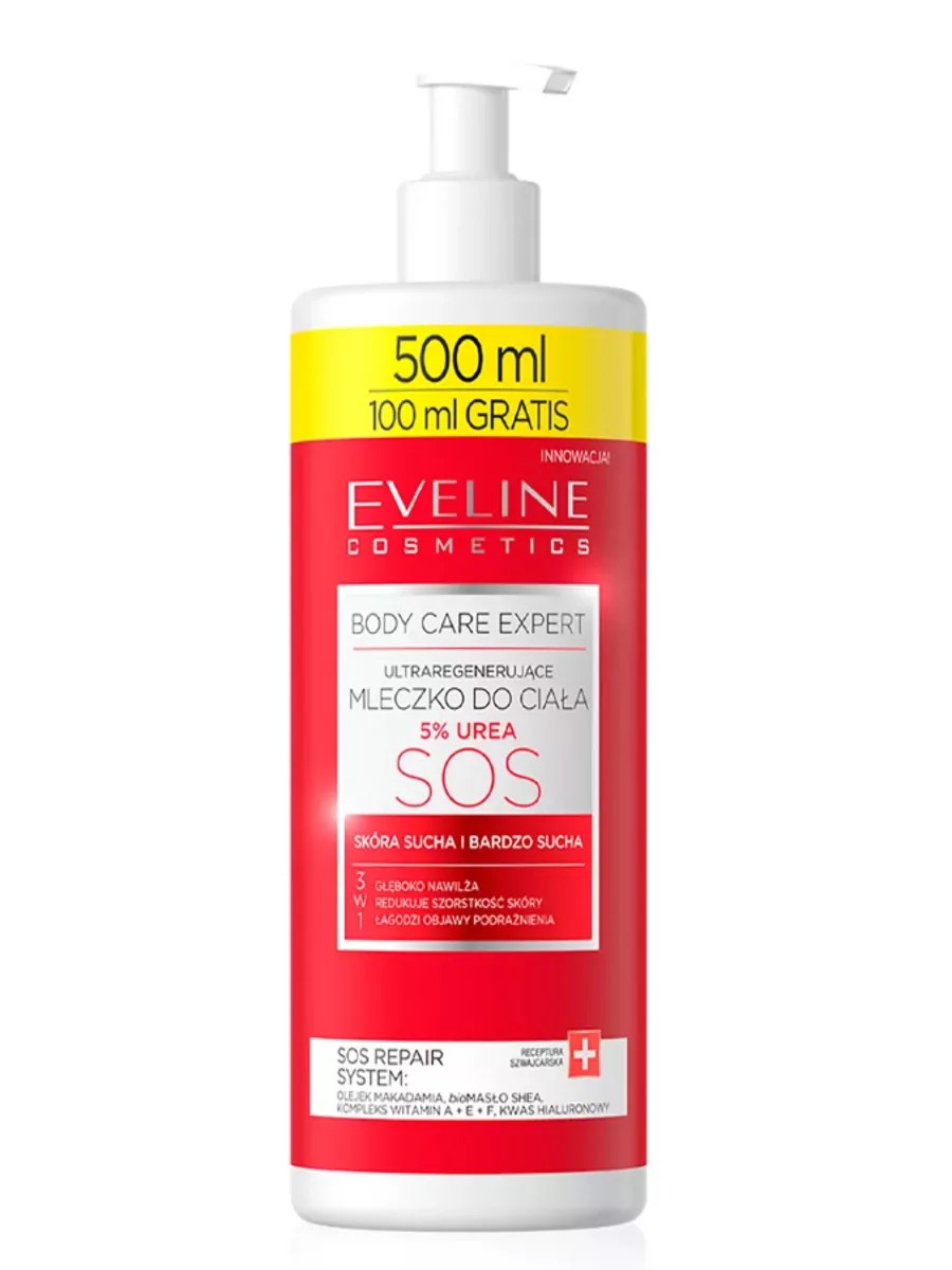 An ultra-regenerating body milk for dry to very dry skin. Deeply moisturizes, reduces dryness, and soothes irritation. This body milk acts as an intensive skin care complex based on concentrated active ingredients: a 5% urea complex, hyaluronic acid, and the SOS REPAIR SYSTEM, rich in soothing ingredients that effectively nourish and bring long-lasting relief to dry and very dry skin from the first use. A unique ultra-regenerating formula: 5% UREA COMPLEX provides long-lasting hydration, promoting the penetration of active ingredients deep into the skin, leaving it hydrated, smooth, and velvety to the touch. Hyaluronic acid restores optimal skin hydration. Perfectly strengthens, tones, and helps skin maintain a youthful appearance. SOS REPAIR SYSTEM: macadamia oil soothes and nourishes. Bio-maso shea butter regenerates, effectively retains water in the epidermis, strengthens, and tones. Vitamins A+E+F and D-Panthenol provide comprehensive skin care and soothe irritation and dryness. Directions: Apply to clean, dry skin every morning and evening. Ingredients: Aqua (Water), Paraffinum Liquidum, Cetearyl Alcohol, Petrolatum, Glycerin, Isopropil Myristate, Ceteareth-20, Dimethicone, Polybutene, Butyrospermum Parkii Butter, Macadamia Ternifolia Seed Oil, Glycine Soja Oil, Olus Oil, Laminaria Hyperborea Extract, Caesalpinia Spinosa Gum, Hydrolyxed Caesalpinia Spinosa Gum, Sodium Hyaluronate, Urea, Allantoin, Panthenol, Tocopheryl Acetate, Retinyl Palmitate, Linoleic Acid, Tocopherol, Parfum (Fragrance), Acrylatec/C10-30 Alkyl Acrylate Crosspolymer, Triethanolamine, Phenoxyethanol, Methylparaben, Butylparaben, Ethylparaben, Propylene Glycol, PEG-20 Glyceryl Laurate, Sorbic Acid, Citric Acid, Caprylic/Capric Triglyceride, Diethylhexyl Syringylidenemalonate, Alpha-Isomethyl Lonone, Benzyl Salicylate, Citronellol, Limonene, Hydroxycitronellal, Hexyl Cinnamal, Linalool.