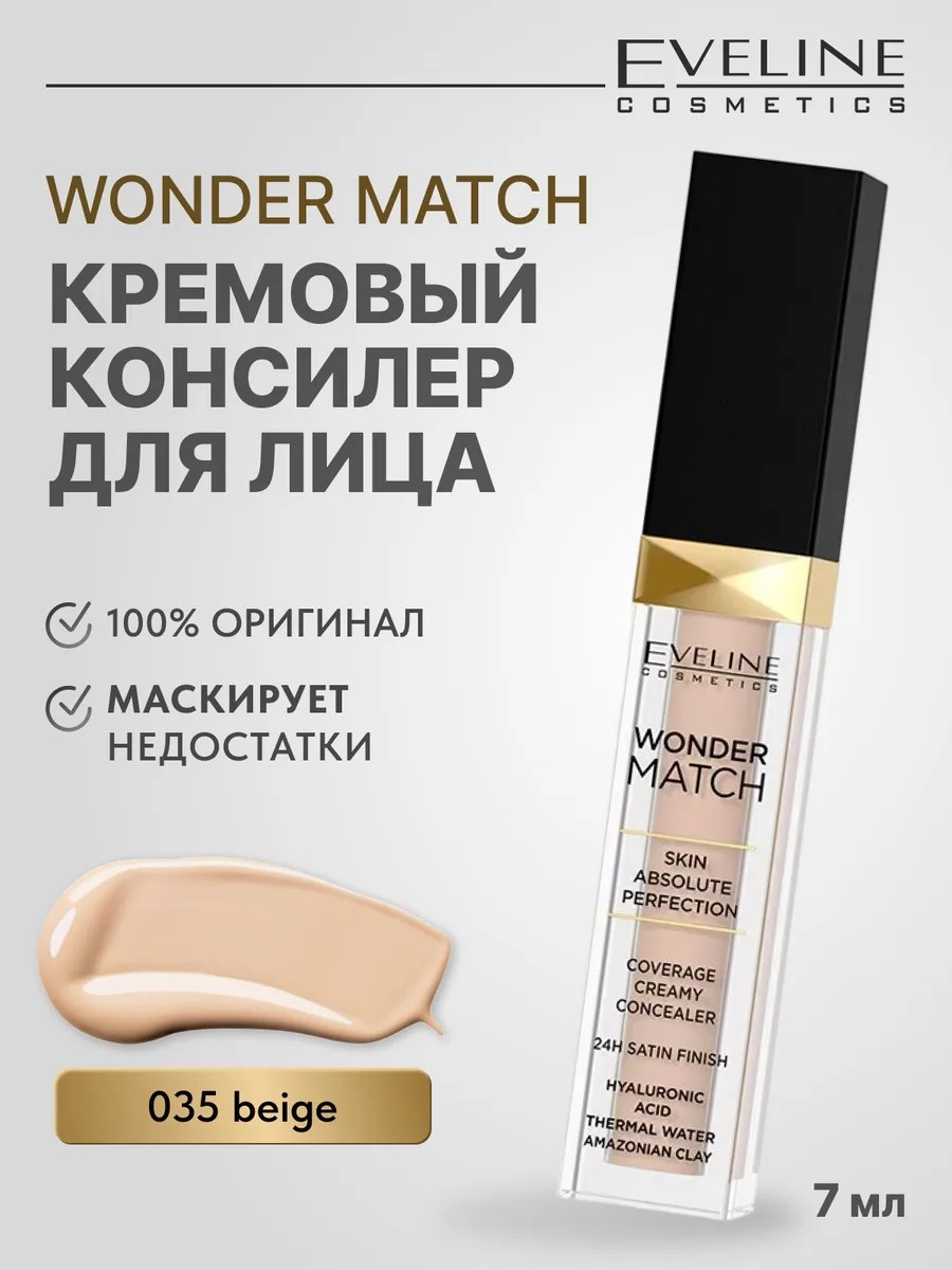 Кремовый консилер Eveline с гиалуроновой кислотой, термальной водой и амазонской глиной для лица WONDER MATCH имеет легкую, кремообразную формулу, которая идеально распределяется на коже и позволяет наращивать степень покрытия.
