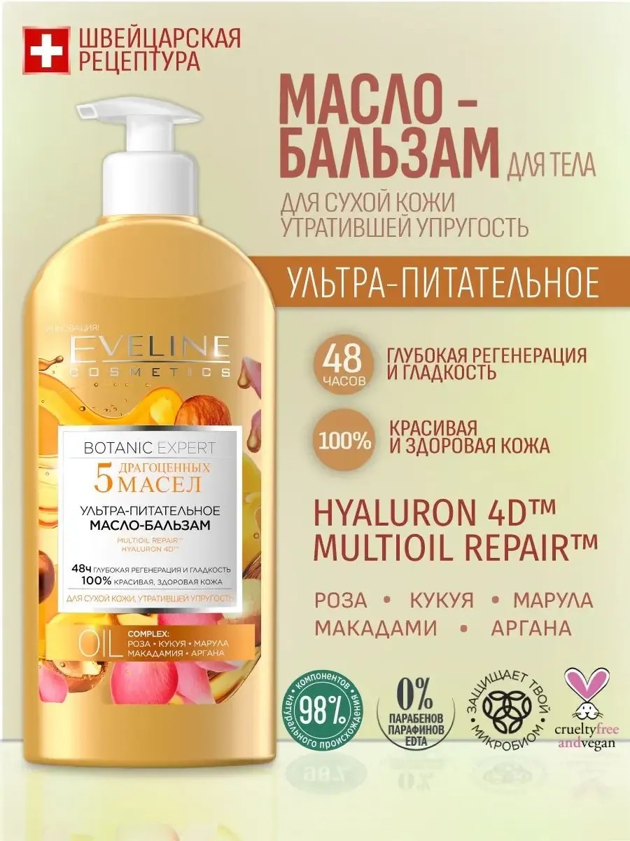 EVELINE's ultra-nourishing Botanic Expert 5 Precious Oils Body Oil-Balm is ideal for restoring skin firmness and elasticity. It contains plant extract and rose flower, argan, macadamia nut, sclerocarya, and kukui nut oils.