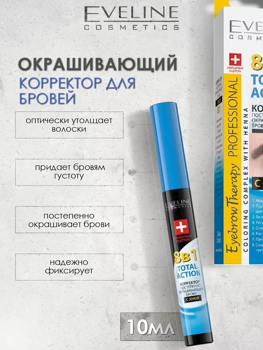 Корректор бровей постепенно окрашивающий 8 в 1 Total Action с хной от EVELINE — это уникальное средство для бровей, которое выполняет множество функций. Он придаёт бровям естественный оттенок с живым блеском, оптически утолщает и «сгущает» их, укладывает в одном направлении и надёжно фиксирует форму.