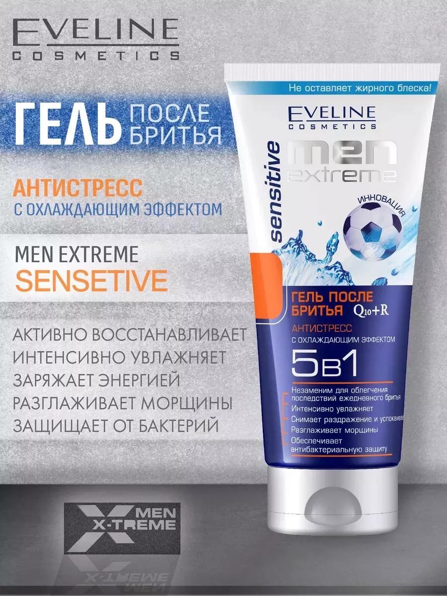 Гель после бритья eveline Men Extreme SENSITIVE Q10+R АНТИСТРЕСС 5в1 обеспечивает немедленный уход за чувствительной кожей. Новая формула с коэнзимами Q10+R, витаминами и экстрактом ромашки разглаживает морщины, стимулирует обновление кожи и восстанавливает упругость. Гель после бритья мужской уменьшает раздражение, покраснение и жжение, заживляет микроповреждения после бритья, устраняет сухость, увлажняет интенсивно, восстанавливает кожу, обеспечивает антибактериальную защиту. увлажняющий гель для лица мгновенно впитывается, не оставляя жирного блеска.