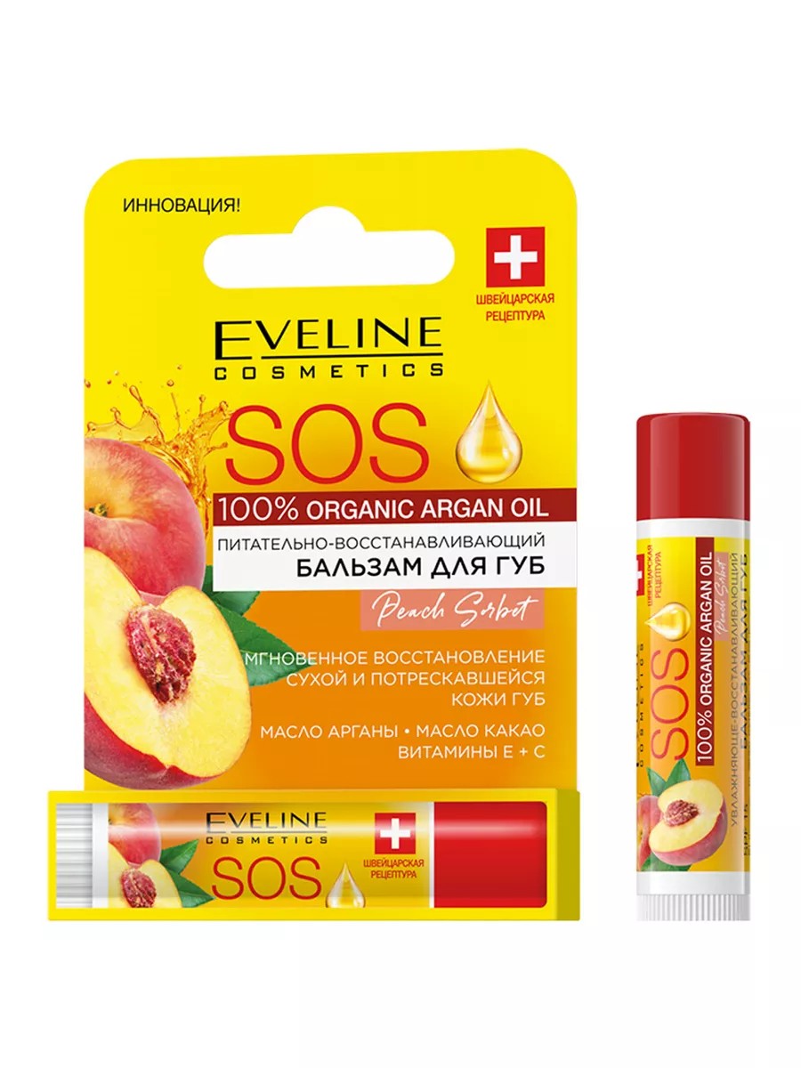 Eveline Cosmetics SOS 100% Organic Argan Oil Бальзам для губ Peach Sorbet SPF15 4,5г. Питательно-восстановительный бальзам для губ SOS ARGAN OIL - это инновационный продукт, разработанный специально для ухода за сухой и потрескавшейся кожей губ. Он обогащен маслом аргана - передовым активным компонентом, который действует совместно с другими натуральными ингредиентами, такими как ланолин, витамин Е, масло какао, манго и другие. Бальзам обеспечивает интенсивное увлажнение, регенерацию и смягчение кожи губ, защищая их от трещин и обветривания. SPF15 фильтр оберегает деликатную кожу от негативного воздействия солнечных лучей, предотвращая преждевременное старение и пигментацию. Уже после первого использования сухие и поврежденные губы становятся мягкими, гладкими и увлажненными, возвращая ощущение комфорта. Бальзам SOS ARGAN OIL идеально подходит для ежедневного применения и может использоваться как основа под помаду или блеск для губ, улучшая их стойкость и придавая губам здоровый вид. Состав бальзама SOS ARGAN OIL включает только натуральные и безопасные ингредиенты, которые заботятся о коже губ и обеспечивают ей надежную защиту на протяжении всего дня. Благодаря своей легкой текстуре, бальзам легко наносится и быстро впитывается, не оставляя ощущения липкости или жирности.