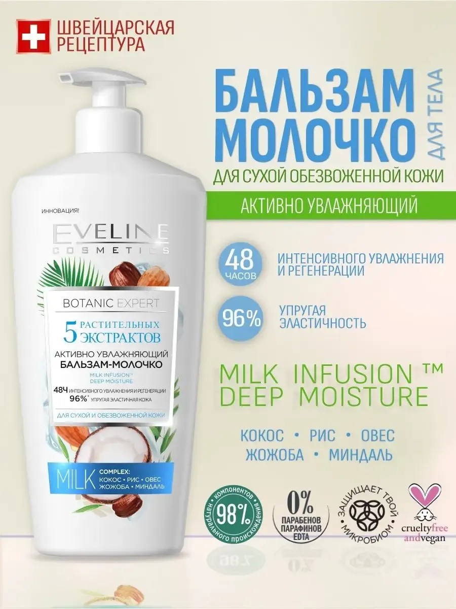 Бальзам молочко для тела eveline Botanic expert обладает активным увлажняющим действием, рекомендуется для ухода за сухой и обезвоженной кожей. В основе увлажняющего молочка для тсухой кожи лежит технология Милк Infusion, которая обеспечивает ревитализирующий эффект и способствует укреплению и разглаживанию кожи. Формула продукта включает пять растительных экстрактов, которые способствуют глубокой регенерации, максимальному укреплению и улучшению эластичности кожи, обеспечивая интенсивное увлажнение. Ключевыми компонентами молочка являются кокос, рис, овес, жожоба и миндаль.