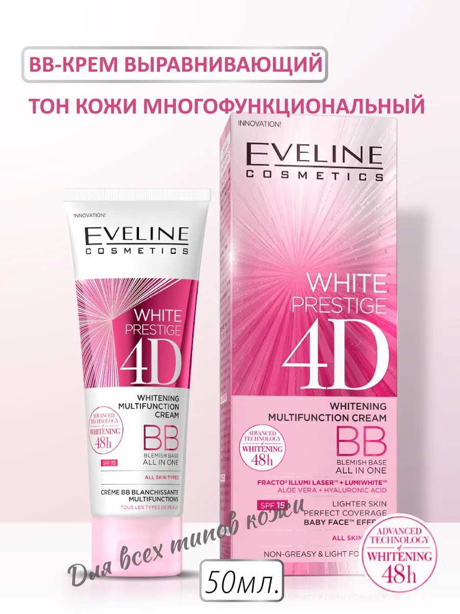 Отбеливающий BB-крем для лица Eveline White Prestige 4D на основе уникального отбеливающего комплекса Lumiskin & 4D White Complex мгновенно осветляет, увлажняет, смягчает и совершенствует кожу, обеспечивая немедленный эффект идеально гладкой кожи, напоминающей детское лицо. Инновационные активные ингредиенты bb-крема отражают свет и нейтрализуют серый оттенок, оставляя кожу сияющей. Бархатистая текстура быстро распределяется, эффективно скрывая недостатки, оставляя кожу расслабленной и возвращая ей естественное сияние и энергию. Центелла азиатская – глубоко питает и поддерживает обновление естественного защитного барьера кожи. Тон для лица с гиалуроновой кислотой интенсивно увлажняет кожу, делая ее мягкой и шелковистой. Отбеливающий бб крем для лица содержит SPF 15, который защищает кожу от UVA/UVB-излучения.