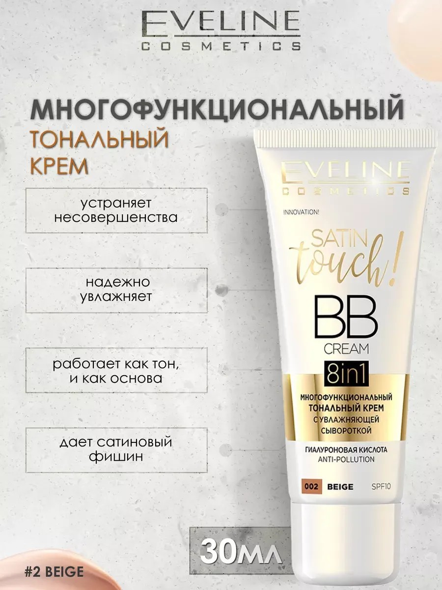Многофункциональный тональный крем для лица в оттенке 002 BEIGE Satin Touch BB cream 8in1 от EVELINE - не просто тональная основа, это источник увлажнения и заботы о вашей коже в одном флаконе.