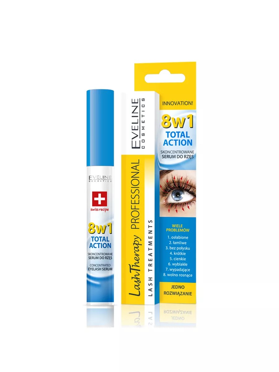 Eveline Cosmetics 8-in-1 Total Action Concentrated Eyelash Serum 10ml. Intensive care for weakened and brittle eyelashes. The serum works in 8 directions, visibly strengthening eyelashes and improving their appearance. A unique formula with a high concentration of active ingredients guarantees visible results. Known for their unique properties: D-panthenol, soy proteins, hyaluronic acid and argan oil - effectively regenerate and protect, stimulate renewal and growth of eyelashes, preventing their breakage and loss. Weakened eyelashes regain elasticity and shine. Eveline Cosmetics presents 8-in-1 Total Action eyelash growth product - the ideal product for strengthening and caring for weakened, brittle eyelashes! This concentrated serum is designed to meet the needs of modern women who want healthy, long and beautiful eyelashes without resorting to false eyelashes.