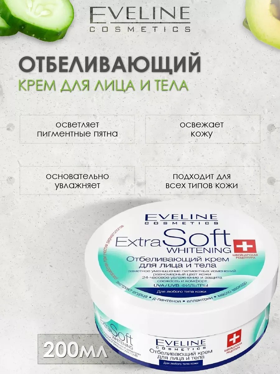 Инновационный отбеливающий крем для лица Extra Soft whitening от eveline Cosmetics эффективно уменьшает существующие пигментные изменения и предотвращает появление новых, благодаря чему кожа приобретает здоровый и ровный цвет. Активные компоненты крем от пигметации обеспечивают комплексное увлажнение, разглаживание и освежение кожи. Осветляющий крем содержит экстракт огурца, содержащий витамин С и органические кислоты, для отбеливания кожи. Масло авокадо, подобное натуральным липидам, защищает кожу от пересушивания, потери влаги и упругости, питает и основательно регенерирует. Д-пантенол и аллантоин нормализуют процесс восстановления клеток кожи, оказывают успокаивающее и противовоспалительное действие, интенсивно увлажняют.