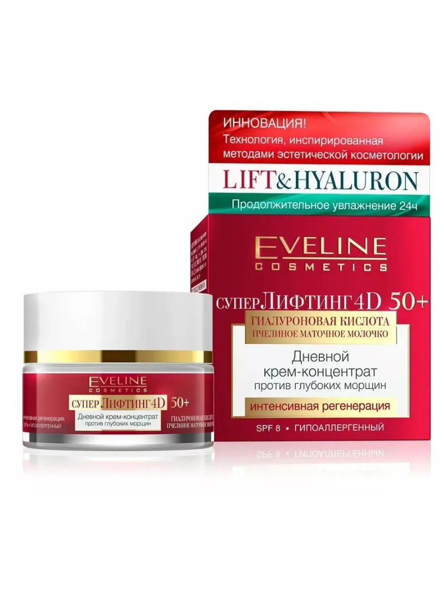 Серия LIFTING 4D — это инновационная программа против морщин с лифтинговым и моделирующим эффектом для зрелой кожи старше 40 лет. Формулы косметики были разработаны на основе тройной современной технологии LIFT&HYALURON, вдохновленной методами эстетической дерматологии. SUPER EFFECT 4D - четырехмерное воздействие на поверхность эпидермиса: увлажнение, укрепление, упругость, эластичность. Это энергия, необходимая для четырех клеточных процессов, в четыре раза более продолжительная жизнь клеток кожи, воздействие на все слои эпидермиса: точно, быстро, долгосрочно, эффективно. SUPER EFFECT 4D - энергия 4-х сил природы, в одной баночке, у вас под рукой! Усовершенствованная формула омоложения. Концентрированный дневной и ночной крем на базе многолетних научных исследований, действуют в четырех направлениях для омоложения кожи. SUPER EFFECT 4D: уменьшение количества, длины, видимости и глубины морщин. Результат: омоложение биологического возраста кожи. Способ применения: наносить на очищенную кожи лица утром или вечером, в зависимости от назначения крема. Состав: Aqua (Water), Glycerin, Ethylhexyl Methoxycinnamate, Cetearyl Alcohol, Ceteareth-20, Sodium, Polyacrylate, Glycine Soja Oil, Sodium Hyaluronate, Argania Spinosa Kernel Oil, Propylene, Glycol, Acacia Seyal Gum Extract, Hydroxypropyl Cyclodextrin, Palmitoyl Tripeptide-38, Dimethicone, Urea, Hydrolyzed Soy Protein, Panax Ginseng Root Extract, Collagen, Hydrolyzed, Elastin, Equisetum arvense Leaf Extract, Butylene Glycol, Laminaria Hyperborea Extract, Allantoin, Polysorbate 20, PEG-20 Glyceryl Laurate, Tocopherol, Linoleic Acid, Retinyl Palmitate, Phenoxyethanol, Methylparaben, Butylparaben, Ethylparaben, Propylparaben, DMDM Hydantoin, Parfum (Fragrance)