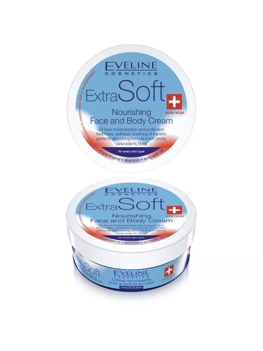 EVELINE, Extra Soft Nourishing Cream for Face and Body, 200 ml. Long-lasting protection for sensitive skin and an instant feeling of comfort. This nourishing cream is the result of a Swiss formula and boasts a rich set of valuable qualities: it is perfectly absorbed, intensely moisturizes, and soothes. After just one use, the skin of the face and body instantly becomes soft and fresh, maintaining a long-lasting feeling of comfort. Avocado oil - like natural lipids, protects the skin from drying out, losing moisture and elasticity; nourishes and thoroughly regenerates. D-panthenol + Allantoin - normalize the process of skin cell regeneration, have a soothing and anti-inflammatory effect. Intensively moisturize. Freshness, softness, and comfort for the skin, does not contain perfume components, is perfectly absorbed.