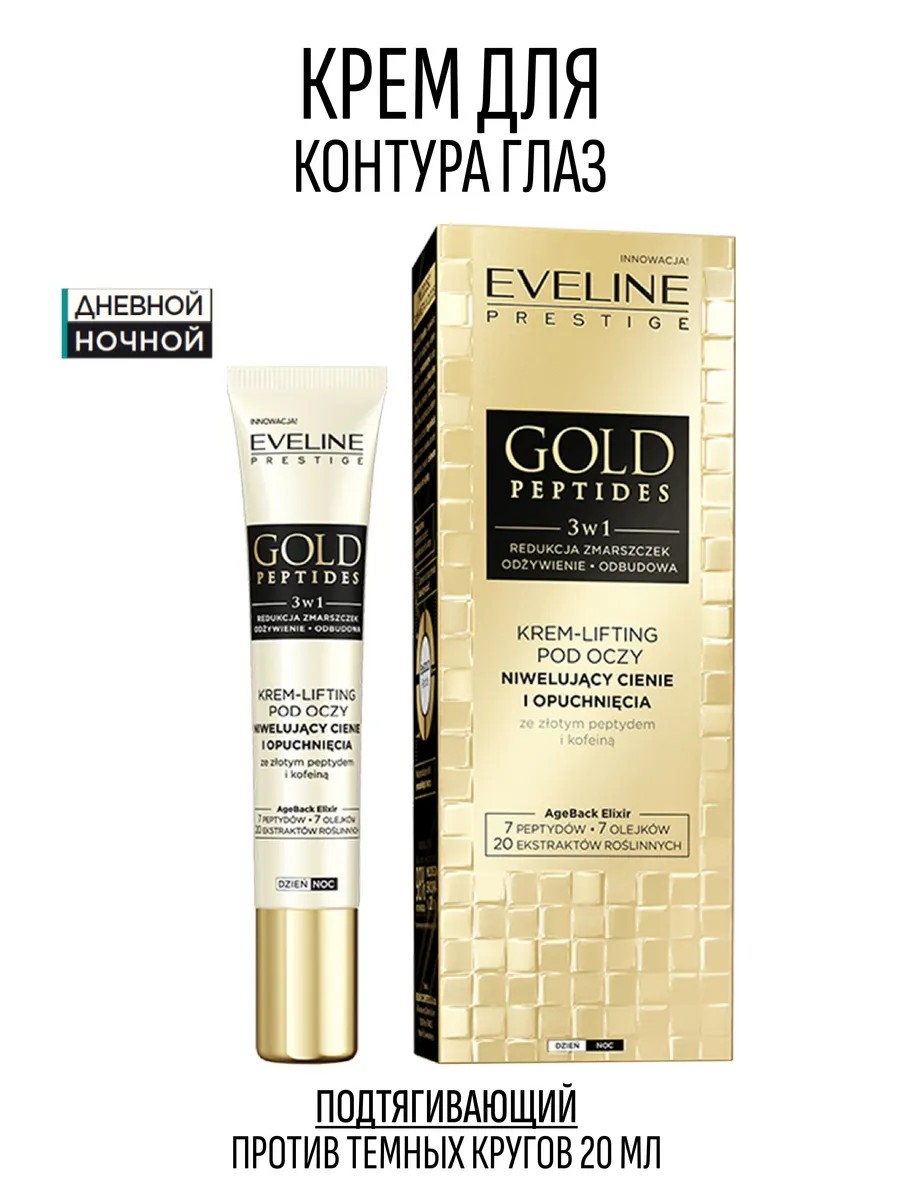 Подтягивающий крем для глаз против темных кругов и отечности EVELINE Gold Peptides с золотыми пептидами – идеальный рецепт красивой кожи. Крем для кожи вокруг глаз обеспечивает видимое улучшение качества кожи вокруг глаз, уменьшая признаки старения и усталости. Крем обогащен керамидами типа 1, 3 и 6-II, Gravity Up, Volufiline и кофеином. Крем для век с кофеином эффективно уменьшает видимость темных кругов под глазами, обладает выраженным восстанавливающим эффектом, слегка приподнимает нависшее веко, возвращая свежесть и молодость. Технологии Gravity Up и Volufiline уменьшают отеки и уменьшают последствия старения кожи. Легкая текстура быстро впитывается и обеспечивает мгновенный лифтинговый и питательный эффект. Отличный выбор для всех, кто хочет сохранить молодость!