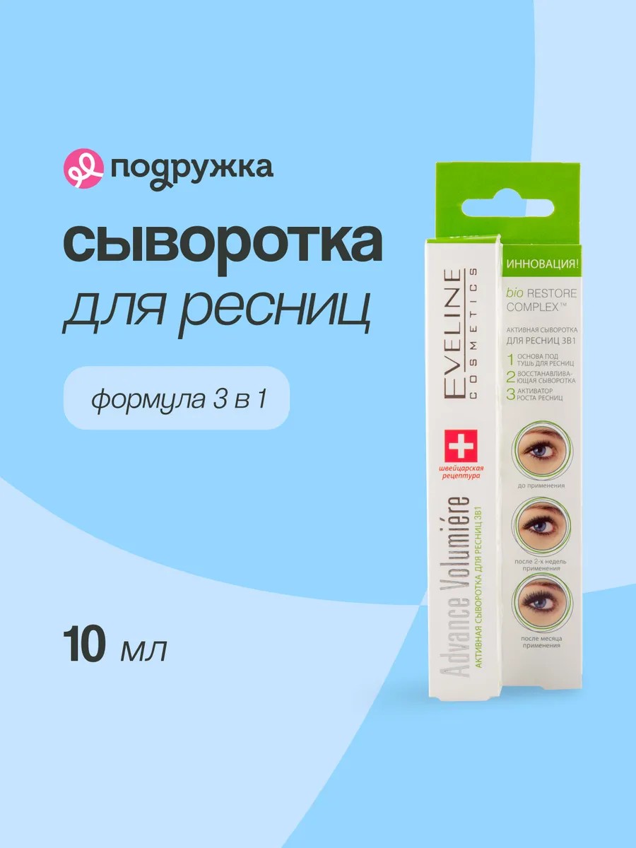 Сыворотка для ресниц EVELINE ADVANCE VOLUMIERE 3 в 1 стимулирует ускоренный рост, укрепляет и защищает. Д-пантенол питает, придает эластичность по всей длине. После нескольких недель ресницы становятся заметно длиннее, гуще и сильнее. Эксклюзивный комплекс активных компонентов Bio-Restore Complex восстанавливает и предупреждает выпадение ресниц. Не содержит ароматических добавок. Не вызывает раздражения глаз. Оптимально подходит людям, которые используют контактные линзы.