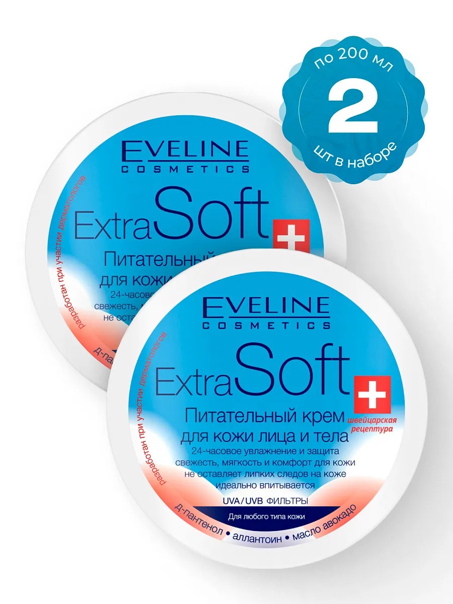 В наборе 2 крема по 200 мл. каждый. Питательный крем для кожи лица и тела Extra Soft от Eveline Cosmetics - это универсальное средство, созданное по швейцарским рецептурам, идеально подходящее для любого типа кожи. Обеспечивает 24-часовое увлажнение и надежную защиту, даря ощущение свежести, мягкости и комфорта. Масло авокадо в составе действует как натуральный липид, защищая кожу от пересушивания, потери влаги и способствуя её регенерации и питанию. Д-пантенол и аллантоин нормализуют процессы восстановления клеток, оказывают успокаивающее и противовоспалительное действие, а также интенсивно увлажняют кожу. Приятный расслабляющий аромат создает мгновенное ощущение уюта и свежести сразу после нанесения. Благодаря легкой текстуре крем быстро впитывается, не оставляя жирной пленки. Идеально подходит для ежедневного использования. Способ применения: ежедневно утром и вечером наносить легкими массажными движениями на кожу лица и тела.