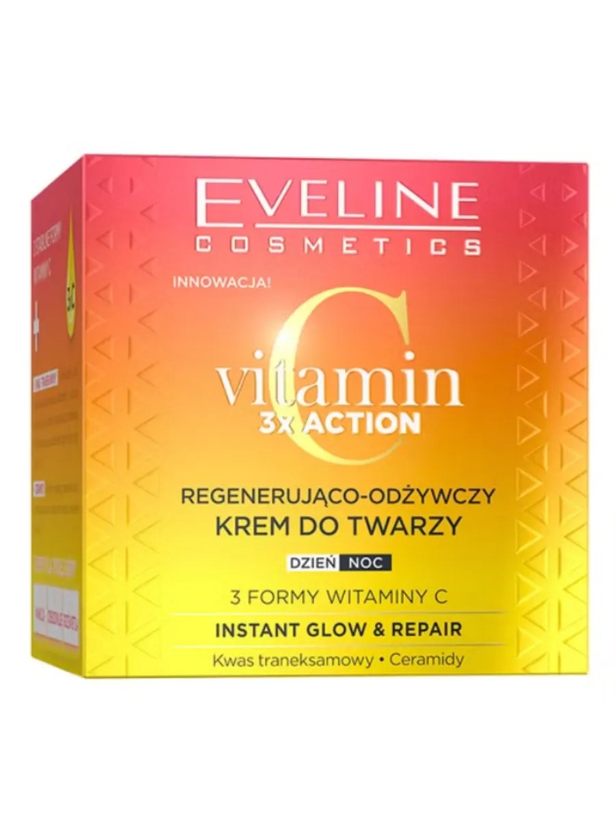 Восстанавливающий крем для лица vitamin C 3x Action день/ночь- прекрасное косметическое средство с действием, которое помогает идеально ухаживать за кожей и питать ее. Уникальная формула содержит концентрированный комплекс из 3 стабильных форм витамина С, который эффективно уменьшает признаки старения или изменения цвета. Благодаря транексамовой кислоте и керамидам кожа становится гладкой, эластичной, увлажненной и эффективно защищенной от негативного воздействия окружающей среды. Крем мгновенно впитывается, а его легкая текстура делает его очень приятным для нанесения. Это идеальный продукт для тех, кто хочет сохранить молодость и жизненную силу своей кожи. Результат: Уменьшает признаки старения кожи. Способствует регенерации и питанию. Улучшает состояние кожи. Эффективно увлажняет и питает. Уменьшает изменение цвета. Восстанавливает сияние. Способ применения: наносить на очищенную кожу лица, шеи и декольте утром и/или вечером. Состав:Aqua (Water), Caprylic/Capric Triglyceride, Butyrospermum Parkii Butter, Cetyl Alcohol, Glyceryl Stearates, Myristyl Myristate, Glycerin, Disodium Cetearyl Sulfosuccinate, Mangifera Indica Seed Butter, Olea Europaea Fruit Oil, Helianthus Annuus Seed Wax, Squalane, Vaccinium Macrocarpon Fruit Powder, Ascorbyl Tetraisopalmitate, Ascorbyl Palmitate, Ascorbyl Glucoside, Tranexamic Acid, Ceramide NP, Ceramide AP, Ceramide EOP, Phytosphingosine, Tocopheryl Acetate, Betaine, Ferulic Acid, Hydroxypropyl Cyclodextrin, Tripelargonin, Sodium Lauroyl Lactylate, Cholesterol, Polydextrose, Mannitol, Dipropylene Glycol, l,2-Hexanediol, Algin, Phenoxyethanol, Hydroxyacetophenone, Ethylhexylglycerin, Tapioca Starch, Microcrystalline Cellulose, Tricalcium Phosphate, Acrylates/C10-30 Alkyl Acrylate Crosspolymer, Xanthan Gum, Carbomer, Magnesium Hydroxide, Sodium Hydroxide, Parfum (Fragrance), Cl 77491 (Iron Oxide), Cl 19140, Benzyl Salicylate, Citronellol, Limonene, Hexyl Cinnamal, Linalool.