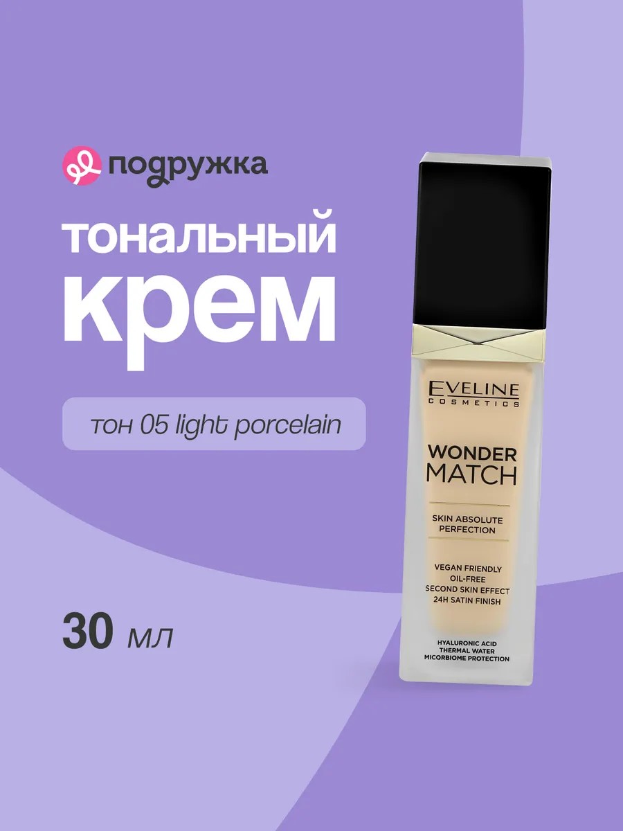 Адаптирующаяся тональная основа WONDER MATCH c гиалуроновой кислотой гарантирует эффект идеальной кожи до 24 часов. Крем удивительным образом подстраивается под тон и структуру кожи, отлично скрывает недостатки без эффекта маски на лице. Инновационная тональная основа имеет натуральный сатиновый финиш, а ее уникальная формула с термальной водой и гиалуроновой кислотой не только ухаживает и увлажняет кожу, но и защищает ее микробиом. АССОРТИМЕНТ: тон 05 Light Porcelain, тон 15 Natural , тон 25 Light Beige, тон 35 Beige.