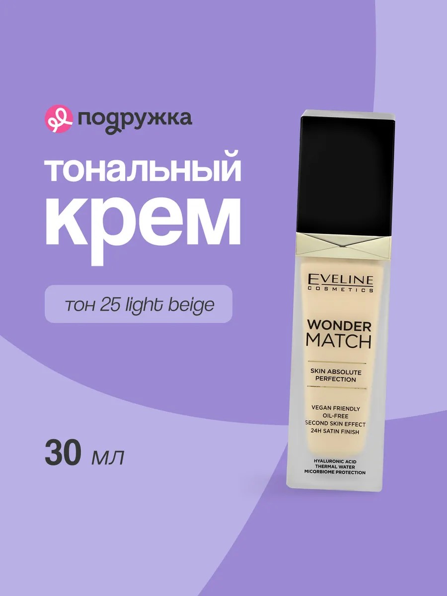Адаптирующаяся тональная основа WONDER MATCH c гиалуроновой кислотой гарантирует эффект идеальной кожи до 24 часов. Крем удивительным образом подстраивается под тон и структуру кожи, отлично скрывает недостатки без эффекта маски на лице. Инновационная тональная основа имеет натуральный сатиновый финиш, а ее уникальная формула с термальной водой и гиалуроновой кислотой не только ухаживает и увлажняет кожу, но и защищает ее микробиом. АССОРТИМЕНТ: тон 05 Light Porcelain, тон 15 Natural , тон 25 Light Beige, тон 35 Beige.