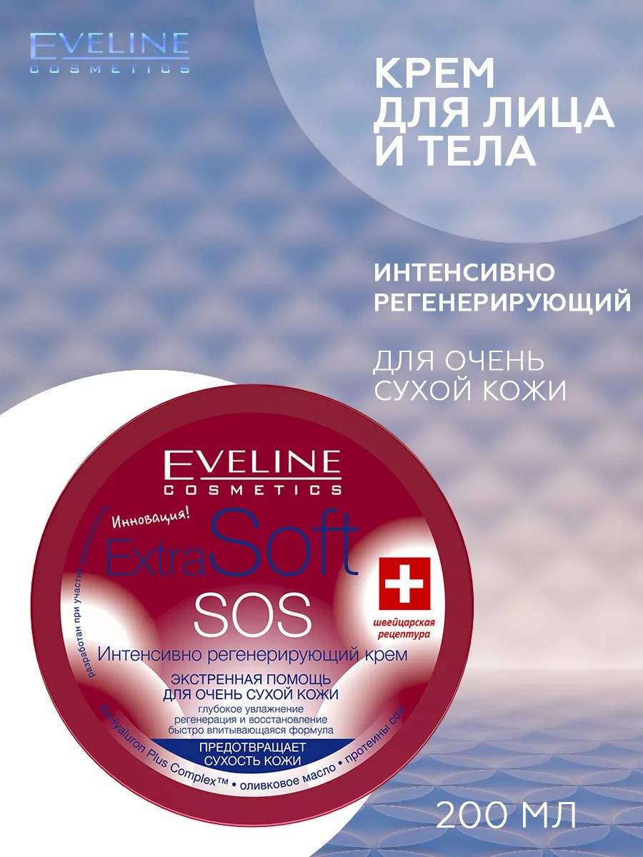 Крем для лица и тела EXTRA SOFT SOS интенсивно регенерирующий для очень сухой кожи - окружит вас защитой и заботой. На кожу влияет множество факторов окружающей среды, оставляющих на ней очень неприятный след. Жесткая вода, холод, ультрафиолетовые лучи, ветер и пыль. Крем EXTRA SOFT SOS восстановит природный баланс чувствительной кожи, снимит воспалительный процесс и подарит глубокое увлажнение питание. Инновационная формула bioHyaluron Plus Complex благодаря соединению гиалуроновой кислоты и UREA максимально увлажняет, разглаживает и защищает кожу от пересушивания. Оливковое масло усиливает естественный гидролипидный барьер, глубоко восстанавливая и регенерируя кожу. Протеины сои и экстракт шелка придают коже упругость и эластичность. Д-пантенол и аллантоин смягчают кожу и способствуют регенерации клеток. Витамин Е нейтрализует свободные радикалы и приостанавливает процессы старения.