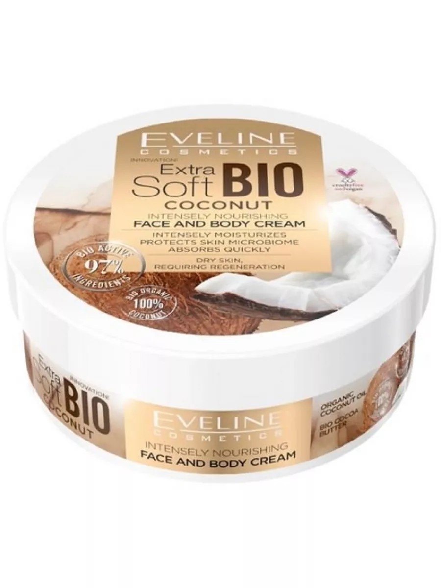 Eveline сosmetics extra soft bio интенсивно питательный крем для лица и тела 200мл, 1 банка. Интенсивно питательный крем для лица и тела обеспечивает сухой коже глубокое восстановление и омоложение, эффективно успокаивает раздражения, интенсивно увлажняет и укрепляет. Бархатистая формула крема быстро впитывается, оставляя на коже нежный приятный запах. Органическое масло кокоса великолепно разглаживает кожу, оставляя её мягкой, гладкой и эластичной. Масло какао, обогащенное жирными кислотами омега-3, 6 и 9, обладает сильными регенерирующими и укрепляющими свойствами, защищает эпидермис от сухости и интенсивно питает, снимает раздражения. Прекрасно подходит для любого типа кожи, даже чувствительной. Способ применения: Наносить ежедневно на очищенную кожу лица и тела.