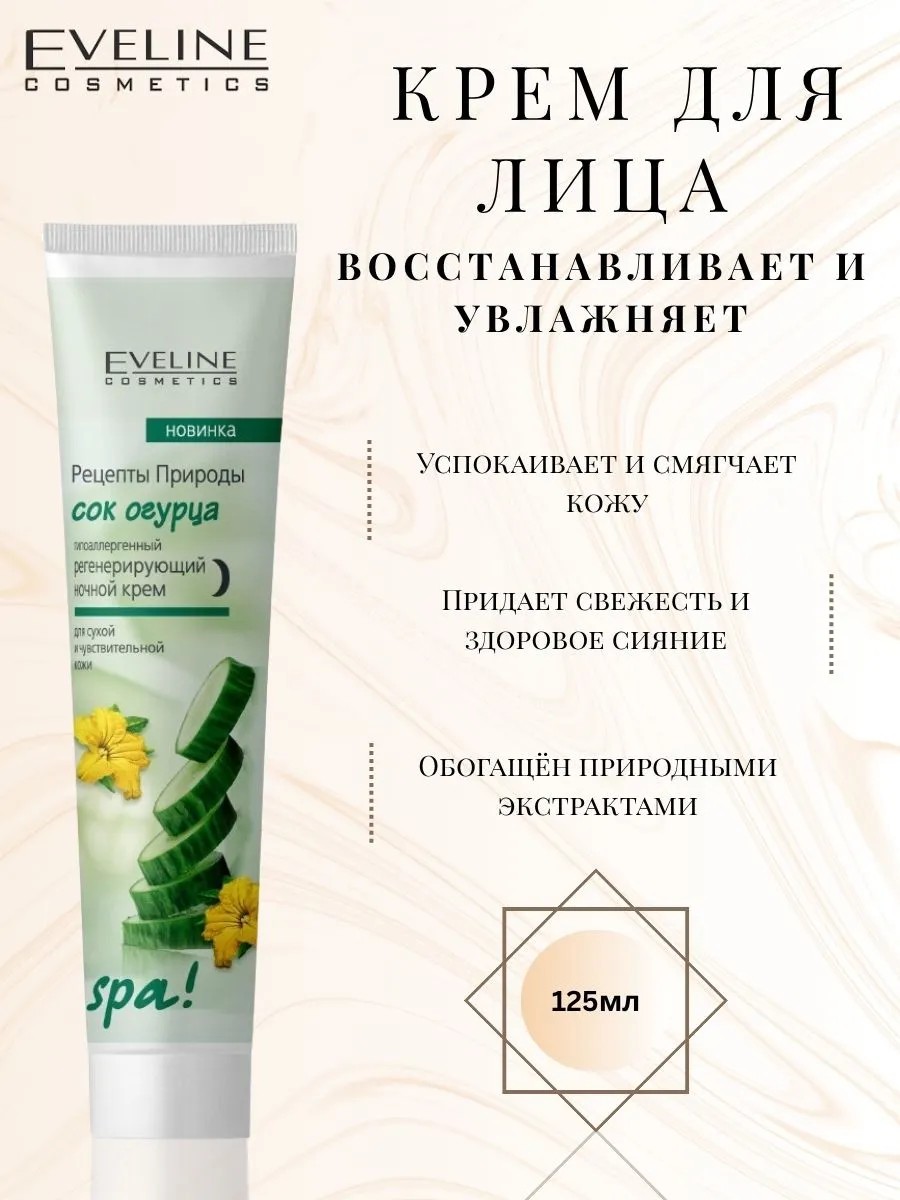 This innovative cream from EVELIN COSMETICS contains rejuvenating cucumber juice, a moisturizing hydrocomplex NMF (Natural Moisturizing Factor), and vitamins A, E, and F. This modern formula intensively regulates metabolic processes at the cellular level. Cucumber juice, an active ingredient rich in mineral salts, trace elements, and organic acids, brightens, tones, and normalizes the skin's condition, helping to retain moisture in the surface and deep layers throughout the night.