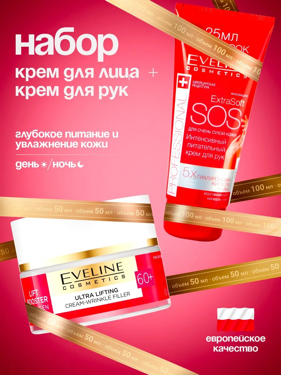 В наборе Крем для лица 60+ объемом 50 мл. и Крем для рук объемом 100 мл. 1. Крем-корректор против морщин с эффектом лифтинга 60+ -это революционное средство, созданное для женщин, стремящихся вернуть своей коже молодость и упругость. Он эффективно разглаживает и моделирует контуры лица, выравнивает тон кожи и значительно повышает её эластичность. Формула LIFT BOOSTER COLLAGEN, вдохновленная неинвазивными методами эстетической медицины, представляет собой альтернативу инъекциям, позволяя достичь видимых результатов без хирургического вмешательства. Крем содержит три формы коллагена, витамин Cg, сигнальные пептиды и спилантол, которые работают в комплексе, обеспечивая глубокое увлажнение и питание кожи. Уже в течение первого месяца использования вы заметите, как ваша кожа становится более молодой и упругой, а овал лица приобретает четкие линии. Крем-корректор не только сокращает морщины, но и придаёт коже жизненную силу и сияние, восстанавливая её естественную красоту. Способ применения: очистить кожу лица, шеи и декольте.Нанести крем.Использовать утром и вечером. 2. Интенсивный питательный крем для рук SOS Extra Soft -это профессиональное средство, созданное для интенсивного ухода за очень сухой и поврежденной кожей рук. Он обладает мощным регенерирующим действием, мгновенно увлажняя и питая кожу, возвращая ей мягкость и шелковистость. Формула крема включает мочевину и гиалуроновую кислоту, которые восстанавливают водный баланс и повышают эластичность кожи. D-пантенол и аллантоин эффективно снимают раздражение и уменьшают покраснения, придавая коже здоровый и ухоженный вид. Витамин Е -мощный антиоксидант, способствует обновлению эпидермиса. Крем имеет легкую текстуру, которая быстро впитывается, не оставляя жирной пленки, и сохраняет свою эффективность на протяжении длительного времени. Идеально подходит для ежедневного использования. Способ применения: наносите небольшое количество крема на чистую кожу рук несколько раз в день для оптимального увлажнения и защиты.
