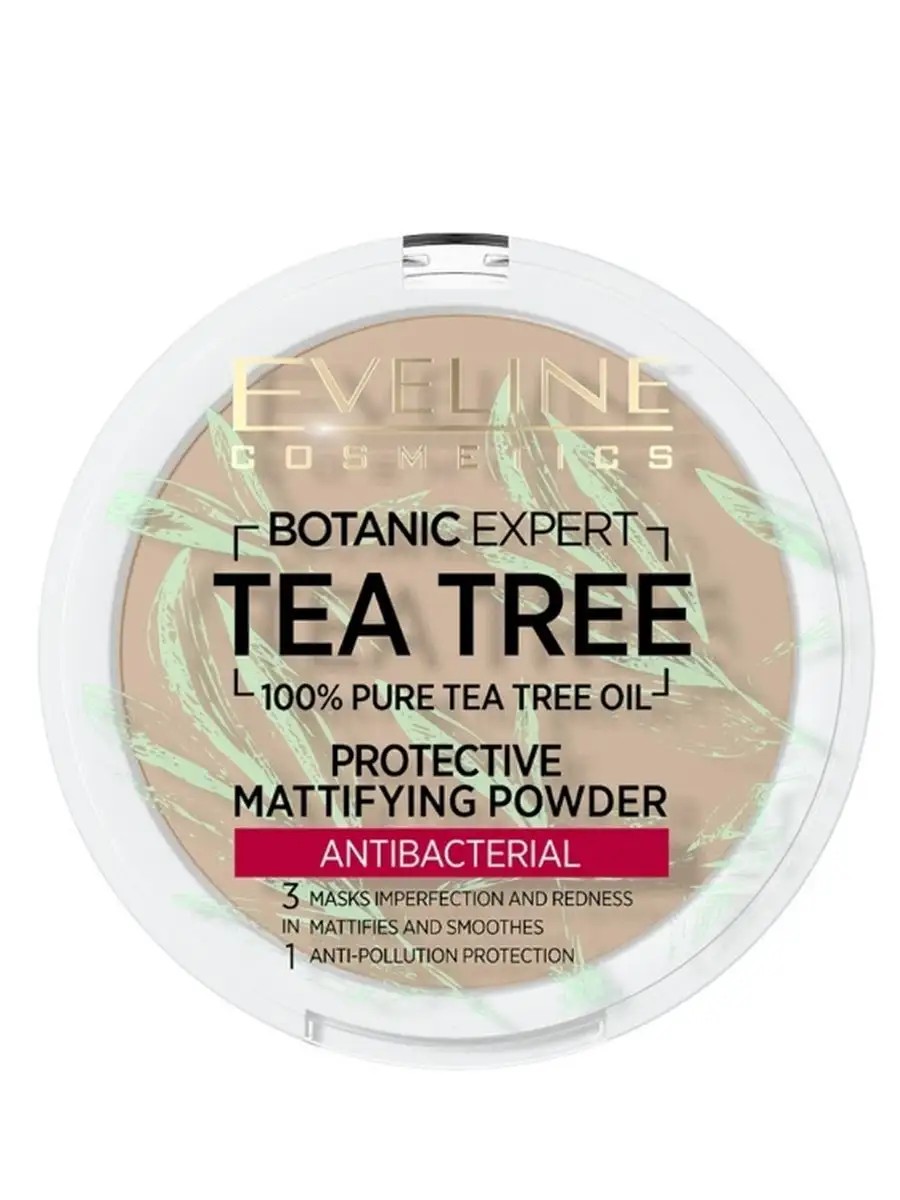 BOTANIC EXPERT TEA TREE Mattifying antibacterial face powder 9 g effectively conceals skin imperfections, sets makeup, helps absorb excess sebum and has a protective, antibacterial and anti-inflammatory effect thanks to tea tree oil, mineral clay and green tea extract in its composition. Tea Tree powder does not emphasize flaking on the skin, does not clog pores, and also allows the skin to breathe. The product is suitable for all skin types, especially oily and combination skin. - Effectively conceals imperfections. - Absorbs excess sebum. - Antibacterial action. - Protects from the negative effects of the environment. - Does not emphasize flaking. - Allows the skin to breathe. How to use: Apply with a powder puff or a brush. Ingredients: alc, Illite, Titanium Dioxide, Zinc Oxide, Paraffinum Liquidum, Ethylhexyl Hydroxystearate, Melaleuca Alternifolia Leaf Oil, Phenoxyethanol, Ethylhexylglycerin, Tocopherol, Helianthus Annuus Seed Oil, Camellia Sinensis Leaf Extract. +/- CI 77491, CI 77492, CI 77499.