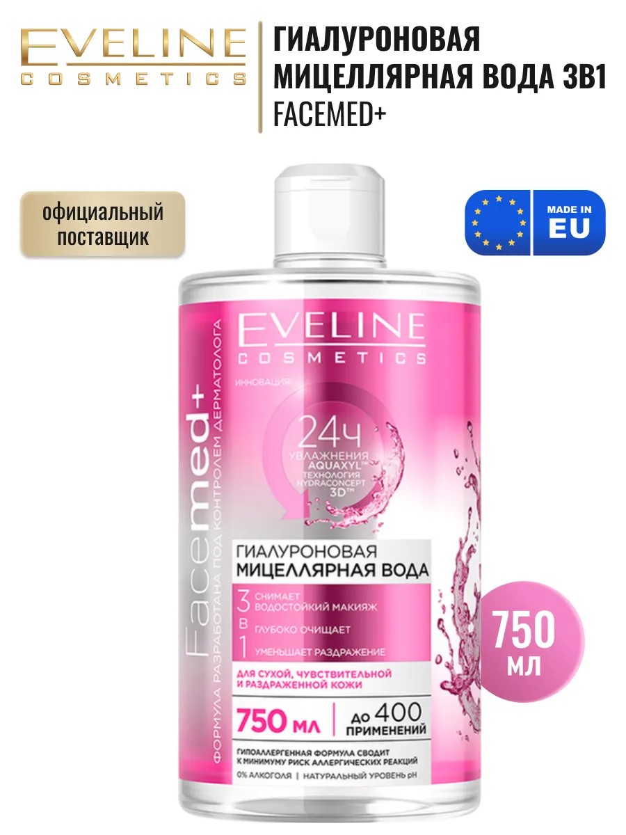 Гиалуроновая мицеллярная вода для снятия макияжа Eveline 3в1 с пантенолом и гипоаллергенной формулой для сухой, очень сухой и чувствительной кожи , объемом 750 мл.
