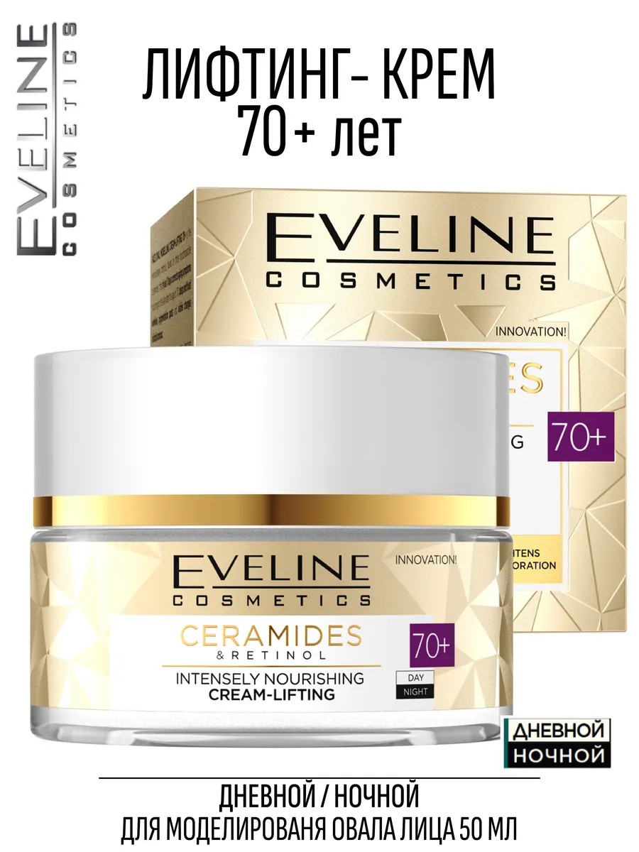 Eveline 70+ Lifting Face Contouring Cream with Ceramides & Retinol reduces dryness and smoothes wrinkles, evens out skin tone, and prevents loss of firmness and elasticity. Eveline Anti-Aging Face Cream 70+ is based on three biocompatible ceramides that eliminate signs of aging within 7 days. This face cream with niacinamide and resveratrol deeply nourishes the epidermis, visibly revitalizes and smoothes dull skin, restoring its well-groomed appearance and youthful radiance. Active ingredients: niacinamide, resveratrol, ceramides, manuka honey, coenzyme Q10, and camellia oil. Apply to clean, dry skin of the face and décolleté morning and evening. Avoid under-eye area and eyelids. This product is intended for morning and evening use. Retinol cream prevents the skin aging process and reduces the appearance of wrinkles.