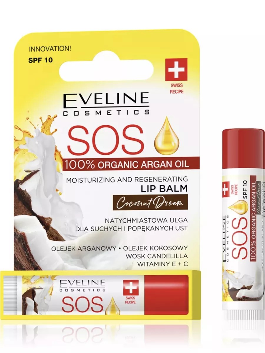 Увлажняюще-восстанавливающий бальзам для губ SOS Coconut Dream- 100% ORGANIC ARGAN OIL- Мгновенное восстановление сухой и потрескавшейся кожи губ- Масло Арганы - Масло Кокоса- Канделильский воск - Витамины Е + СУвлажняюще-восстанавливающий бальзам для губ с приятным ароматом экзотических фруктов разработан для ежедневного ухода за сухой и обезвоженной кожей губ. Инновационная формула, обогащенная активными компонентами и натуральными маслами, интенсивно увлажняет, регенерирует и смягчает кожу губ, предотвращая шелушение и обветривание. Фильтр SPF 10 защищает деликатную кожу губ от вредного воздействия солнечных лучей и внешних факторов, а регулярное использование делает сухие и потрескавшиеся губы мягкими и гладкими.