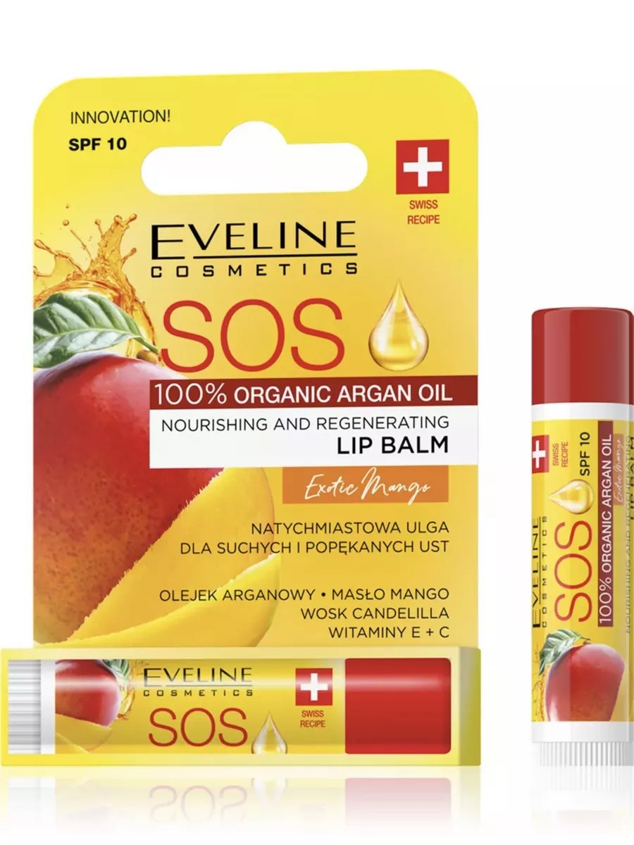 The EXOTIC MANGO S.O.S. ARGAN OIL NOURISHING AND RESTORATING LIP BALM helps restore dry, rough, and chapped lips after just one use. This quickly absorbed, non-sticky formula deeply moisturizes, nourishes, adds shine, and regenerates delicate lips. This is all thanks to its natural formula, which includes active ingredients such as argan oil, candelilla wax, and mango butter, which has an anti-inflammatory effect and protects the skin from UV rays.