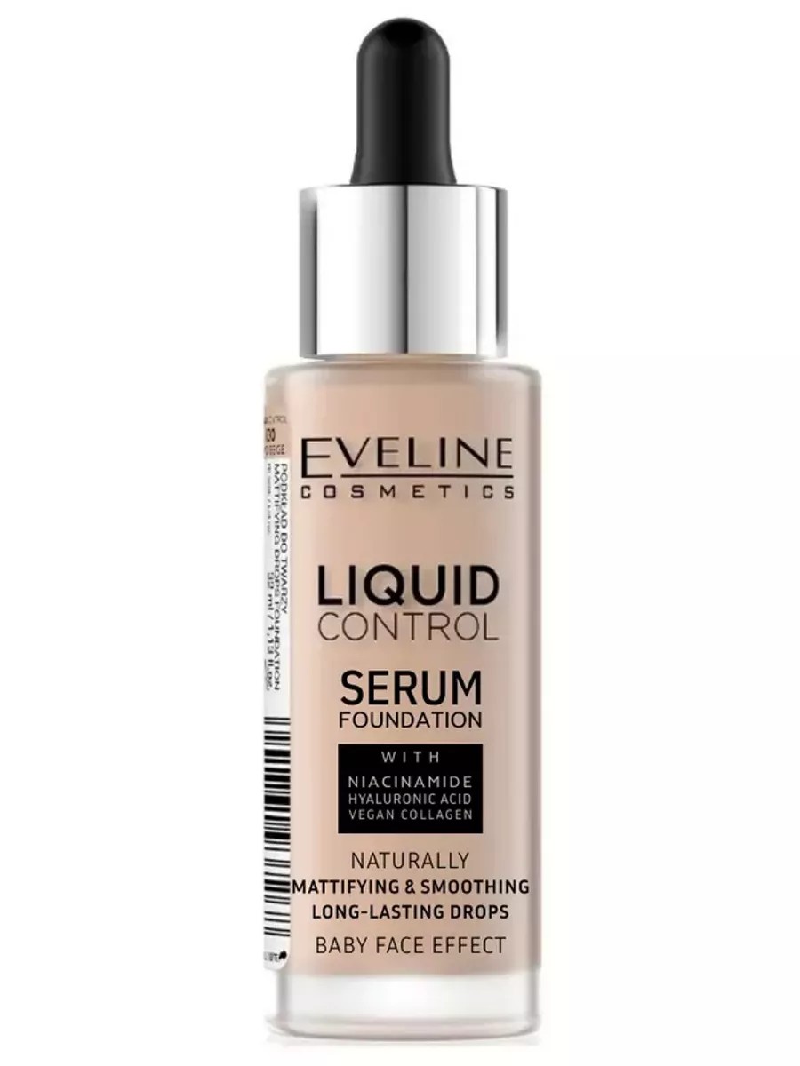 Eveline Liquid Control 30 Sand Biege Innovative Liquid Foundation has a lightweight texture and provides a natural, second-skin effect. It perfectly evens out skin tone and conceals imperfections. It smoothes and provides a natural, radiant finish that lasts all day. The new, improved formula intensively cares for your skin. Contains plant collagen and hyaluronic acid, providing long-lasting hydration, increased elasticity, and smoothness. Niacinamide has an anti-inflammatory effect, fights age-related changes, and restores the skin's barrier function. The easy-to-use, lightweight formula applies with a dropper and lasts up to 24 hours. The face looks flawless and natural. How to use: Apply foundation to your face and blend thoroughly.