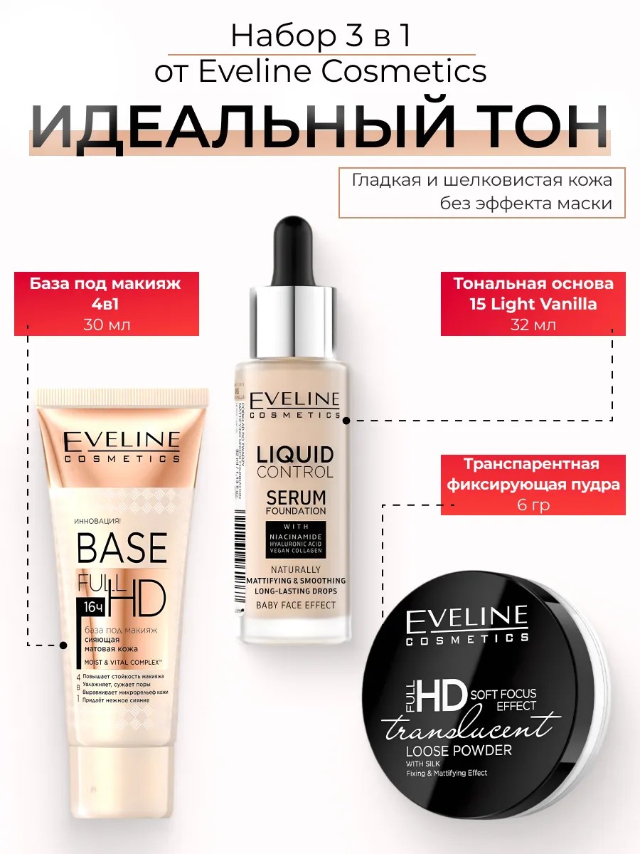 Набор для макияжа: Тональная основа+База+Пудра. 1. Инновационная жидкая тональная основа Liquid Control 15 Light Vanilla обладает легкой текстурой и обеспечивает максимально естественный эффект «второй кожи». Идеально выравнивает тон и маскирует несовершенства. Разглаживает и придает естественное сияющее покрытие на целый день. Содержит растительный коллаген и гиалуроновую кислоту, что обеспечивает длительное увлажнение кожи, повышение упругости и гладкость кожи. Ниацинамид оказывает противовоспалительное действие, борется с возрастными изменениями и восстанавливает барьерную функцию кожи. Удобная в использовании, легко наносится и держится на коже до 24 часов. Лицо выглядит безупречно и при этом естественно. 2. База под макияж 4в1 Base Full HD обладает кремовой структурой, содержащей осветляющие пигменты, которые придают эффект сияния и идеально выравнивают микрорельеф кожи. Шелковистая формула разглаживает и сокращает видимость пор, скрывает несовершенства и нивелирует жирный блеск. Ультраувлажняющий Moist&Vital Complex устраняет признаки усталости и осветляет кожу, оказывает антиоксидантное действие. Формула Anti-Pollution защищает кожу от негативного воздействия внешних факторов. 3. Транспарентная рассыпчатая фиксирующая пудра от Eveline Cosmetics обеспечивает безупречный макияж на протяжении всего дня. Ультралегкая формула нового поколения оптически разглаживает тонкие мимические линии и несовершенства. Эта пудра позволит забыть о жирном блеске, поможет выровнять тон кожи, сделает ее шелковистой и нежной. Сферическая форма абсорбирующих светоотражающих микрочастиц обеспечивает эффект soft focus. Рассыпчатая текстура пудры ложится невесомой вуалью, не утяжеляет макияж и не вызывает на лице чувства стянутости. Идеально подойдет для контуринга, поскольку помогает грамотно подчеркнуть черты лица, которые надо высветлить и вынести на первый план. Подходит для всех типов кожи. Некамедогенна, протестирована дерматологически.