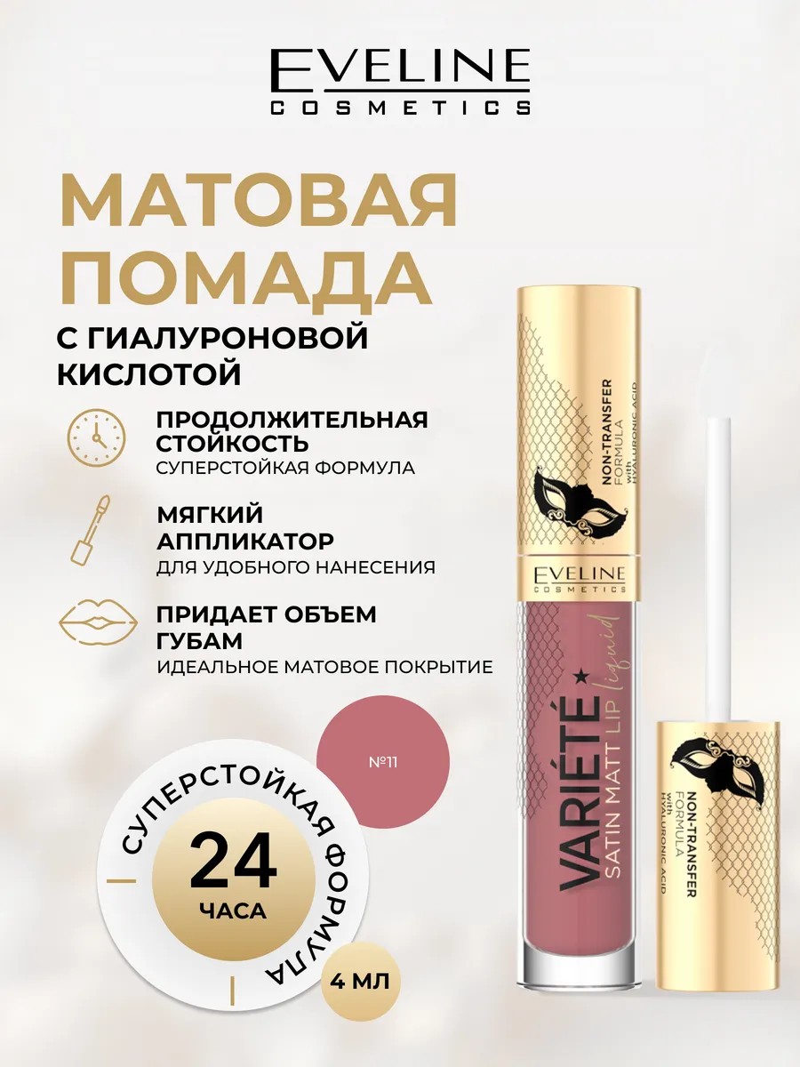 Жидкая помада из серии VARIETE с кремовой текстурой и матовым финишем легко наносится на губы, не растекается и не отпечатывается на маске. Содержащийся в формуле, уникальный увлажняющий и витаминный комплекс с гиалуроновой кислотой и витамином Е, заботится о состоянии нежной кожи губ, предотвращая их пересушивание. Помада держится на губах до 6 часов, а формула NONTRANSFER гарантирует, что цвет останется на губах, а не на других материалах. Приятный шоколадный аромат превращает нанесение в особый, чувственный ритуал