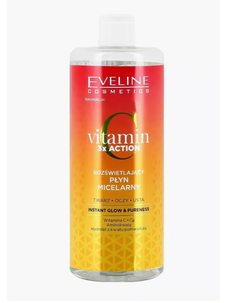 Features of Vitamin C 3x Action Micellar Water: - Vitamin C evens out skin tone, eliminates pigmentation, and provides antioxidant protection; - Accelerates collagen production and slows down the aging process thanks to Vitamin Cg; - Micelles remove impurities, sebum, and makeup from the skin; - Tones the skin, hydrates, and nourishes; - Reduces the impact of external factors on the epidermis; - Evens skin tone, actively combating imperfections; - Accelerates regeneration processes, renewing the skin. How to use: Apply liquid to a cotton pad and gently wipe your face. Ingredients: Aqua (Water), Peg-6 Caprylic/Capric Glycerides, Glycerin, Olive Oil Peg-7 Esters, Caprylyl/Capryl Glucoside, Betaine, Citrus Aurantium Amara Flower Water, Ascorbic Acid, Ascorbyl Glucoside, Sodium Lactate, Pca, Sodium Pca, Sodium Levulinate, Levulinic Acid, Glutamic Acid, Serine, Alanine, Glycine, Lysine Hci, Threonine, Arginine, Proline, Cetrimonium Bromide, Hydroxyacetophenone, Sodium Benzoate, Tetrasodium Glutamate Diacetate Citric Acid, Parfum (Fragrance), Benzyl Salicylate, Hexyl Cinnamal.