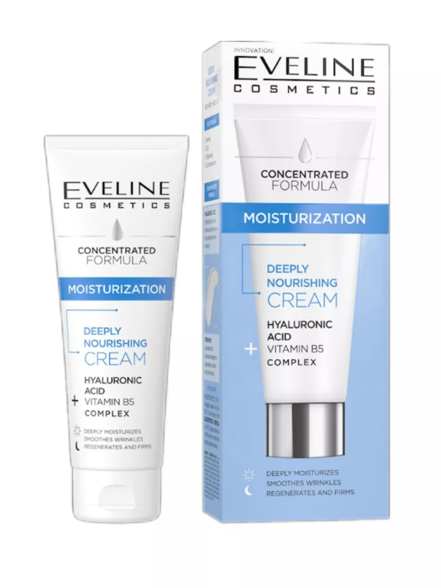 CONCENTRATED FORMULA Day/Night Moisturizing Facial Cream is designed for dry, very dry, and dehydrated skin. HYALURONIC ACID deeply hydrates, improves elasticity, and prevents the appearance of wrinkles. VITAMIN B5 accelerates epidermal regeneration, soothes signs of irritation, and restores a youthful appearance to the skin. Thanks to its extremely light, quickly absorbed formula, this moisturizing cream is ideal for everyday use and under makeup. Directions for use: Thoroughly cleanse your face. Apply CONCENTRATED FORMULA serum to your face, neck, and décolleté. Apply cream over the serum. Ingredients: Aqua (Water), Butyrospermum Parkii Butter, Glycerin, Cetearyl Alcohol, Glyceryl Stearates, Glyceryl Stearate Citrate, Isopropyl Palmitate, Brassica Campestris Seed Oil, Helianthus Annuus Seed Oil, Paeonia Lactiflora Root Extract, Sodium Hyaluronate, Panthenol, Tocopheryl Acetate, Trehalose, Phenoxyethanol, Hydroxyacetophenone, Ethylhexylglycerin, Potassium Sorbate, Sodium Benzoate, Parfum (Fragrance), Sodium Polyacrylate, Citric Acid, BHT.