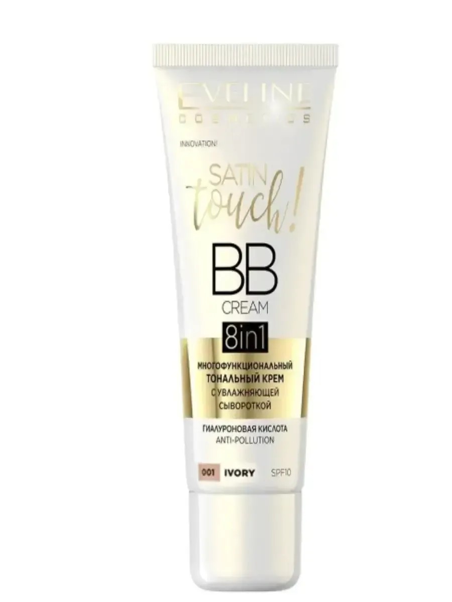 EVELINE Тональный крем многофункциональный с увлажняющей сывороткой 001 Ivory Satin Touch BB Cream 8 в 1, 30 мл, 1 штука. Многофункциональный тональный крем с увлажняющей сывороткой. Устраняет несовершенства, сокращает поры, заполняет морщинки, обеспечивает длительное увлажнение, питает и тонизирует кожу, повышает эластичность и упругость, выравнивает рельеф лица, защищает от воздействия солнечных лучей и устраняет стянутость и сухость. Satin Touch BB Cream это уникальное и многофункциональное косметическое средство, которое работает как тональная основа и увлажняющий крем, Ваш макияж будет выглядеть идеально в течение всего дня. Инновационный комплекс Moist&Vital Complex и гиалуроновая кислота стимулируют производство коллагена и эластина, повышают эластичность и упругость кожи. SPF 10 обеспечивает защиту от солнца и предотвращает появление пигментации! Подходит для любого типа кожи, в том числе чувствительной, проблемной.
