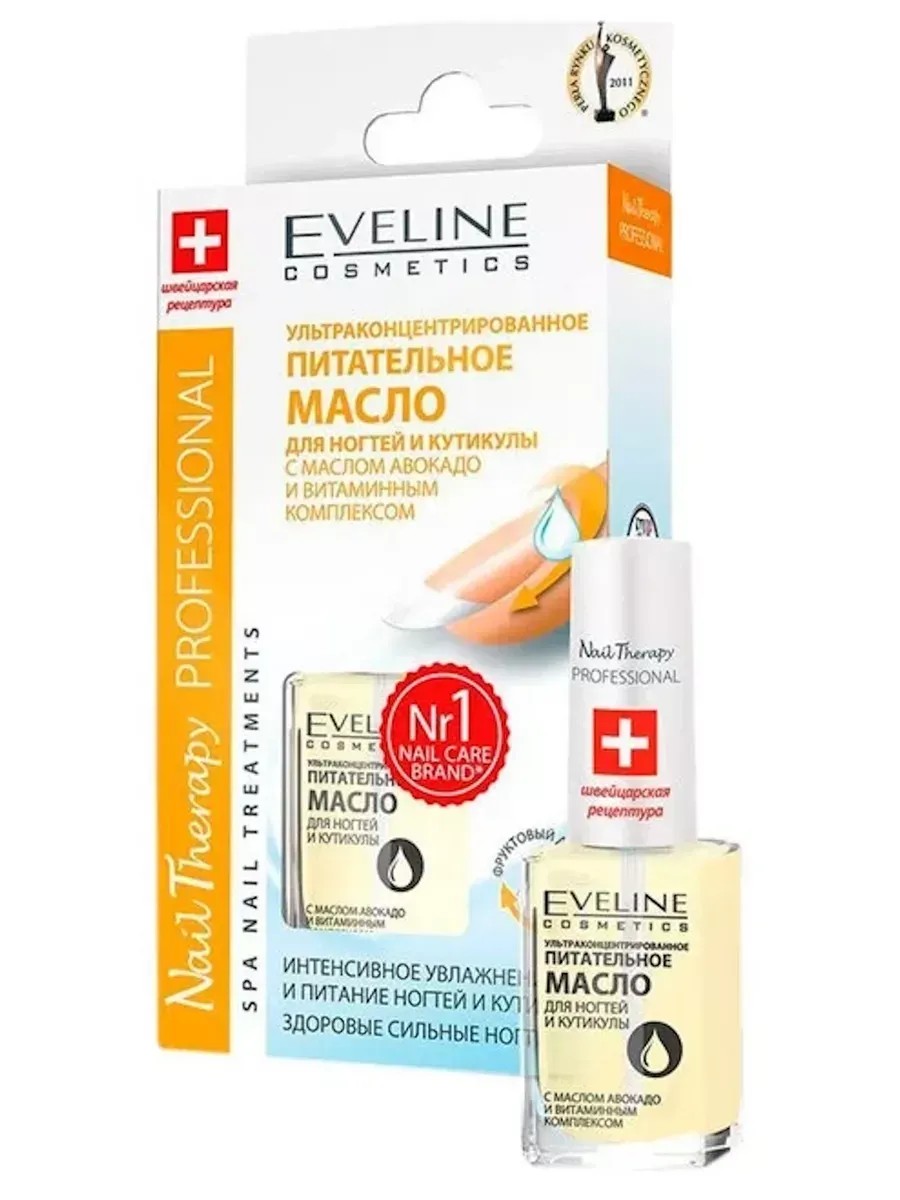 Eveline, Масло для ногтей и кутикулы Nail Therapy с Авокадо и витаминами, 12 мл. Питательное масло Nail Therapy представляет собой уникальный препарат для смягчения кутикулы и восстановления ногтевой пластины. Точно сбалансированная комбинация натуральных масел в сочетании с витаминами останавливает воспалительный процесс ногтевого валика, увлажняет и смягчает ороговевшую кутикулу, предохраняет ногтевую пластину и околоногтевую зону от высыхания и трещин. Свойства миндального масла определяются биологически активными компонентами, входящими в его состав: фитостеролом, амигдалином, глицеридами, линолевой и олеиновой кислотами, витаминами Е и F. Благодаря им миндальное масло быстро впитывается в кожу и ногтевую пластину, доставляя внутрь все полезные элементы. Масло авокадо богато витаминами А, В1, В2, Е, С, содержит фитостеролы и другие макро-и микроэлементы. Обладает интенсивным питательным и увлажняющим действием, предотвращает появление заусенцев, обеспечивает рост длинных и прочных ногтей.