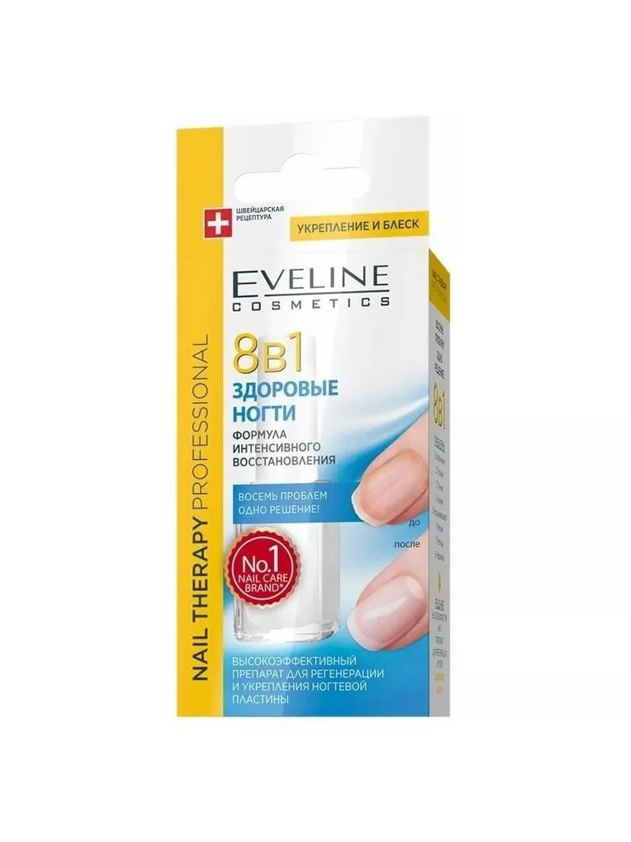 Eveline "Nail Therapy" Professional 8-in-1 Nail Regenerator. Highly effective 8-in-1 nail regenerator for healthy nails. Restorative formula. 8 problems - one solution. Shake before use. On the first day, apply the product directly to the nails. On the second day, apply a second layer of the product. On the third day, remove all layers with nail polish remover and repeat the two-day procedure again. Use for two weeks, then discontinue use for one month. Composition: Butyl acetate, ethyl acetate, nitrocellulose, isopropyl alcohol, phthalic anhydride, trimellitic anhydride, glycols copolymer, acetyl tributyl citrate, aqua (water), acetyl triethyl citrate, formaldehyde, silica, n butyl alcohol, stearalkonium hectorite diamond powder styrene / acrylates copolymer may contain calcium aluminum borosilicate, tin oxide, talc, CI 77742, CI 77499; Volume: 12; Hazard class: 9th class;