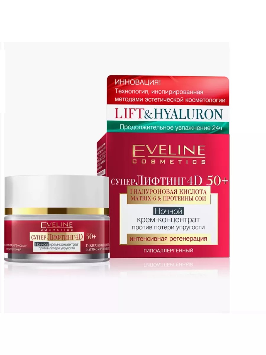 The LIFTING 4D series is an innovative anti-wrinkle program with a lifting and sculpting effect for mature skin over 40. The cosmetic formulas were developed based on the triple modern LIFT & HYALURON technology, inspired by the methods of aesthetic dermatology. SUPER EFFECT 4D - a four-dimensional effect on the surface of the epidermis: hydration, strengthening, elasticity, and firmness. This is the energy necessary for four cellular processes, four times longer skin cell life, and an effect on all layers of the epidermis: precise, fast, long-lasting, and effective. SUPER EFFECT 4D - the energy of four forces of nature, in one jar, at your fingertips! An advanced rejuvenation formula. Concentrated day and night creams, based on many years of scientific research, act in four directions to rejuvenate the skin. SUPER EFFECT 4D: reduction in the number, length, visibility, and depth of wrinkles. Result: rejuvenation of the skin's biological age. Directions: Apply to cleansed skin morning or evening, depending on the cream's intended purpose. Ingredients: Aqua (Water), Glycerin, Ethylhexyl Methoxycinnamate, Cetearyl Alcohol, Ceteareth-20, Sodium, Polyacrylate, Glycine Soja Oil, Sodium Hyaluronate, Argania Spinosa Kernel Oil, Propylene, Glycol, Acacia Seyal Gum Extract, Hydroxypropyl Cyclodextrin, Palmitoyl Tripeptide-38, Dimethicone, Urea, Hydrolyzed Soy Protein, Panax Ginseng Root Extract, Collagen, Hydrolyzed, Elastin, Equisetum arvense Leaf Extract, Butylene Glycol, Laminaria Hyperborea Extract, Allantoin, Polysorbate 20, PEG-20 Glyceryl Laurate, Tocopherol, Linoleic Acid, Retinyl Palmitate, Phenoxyethanol, Methylparaben, Butylparaben, Ethylparaben, Propylparaben, DMDM Hydantoin, Parfum (Fragrance)