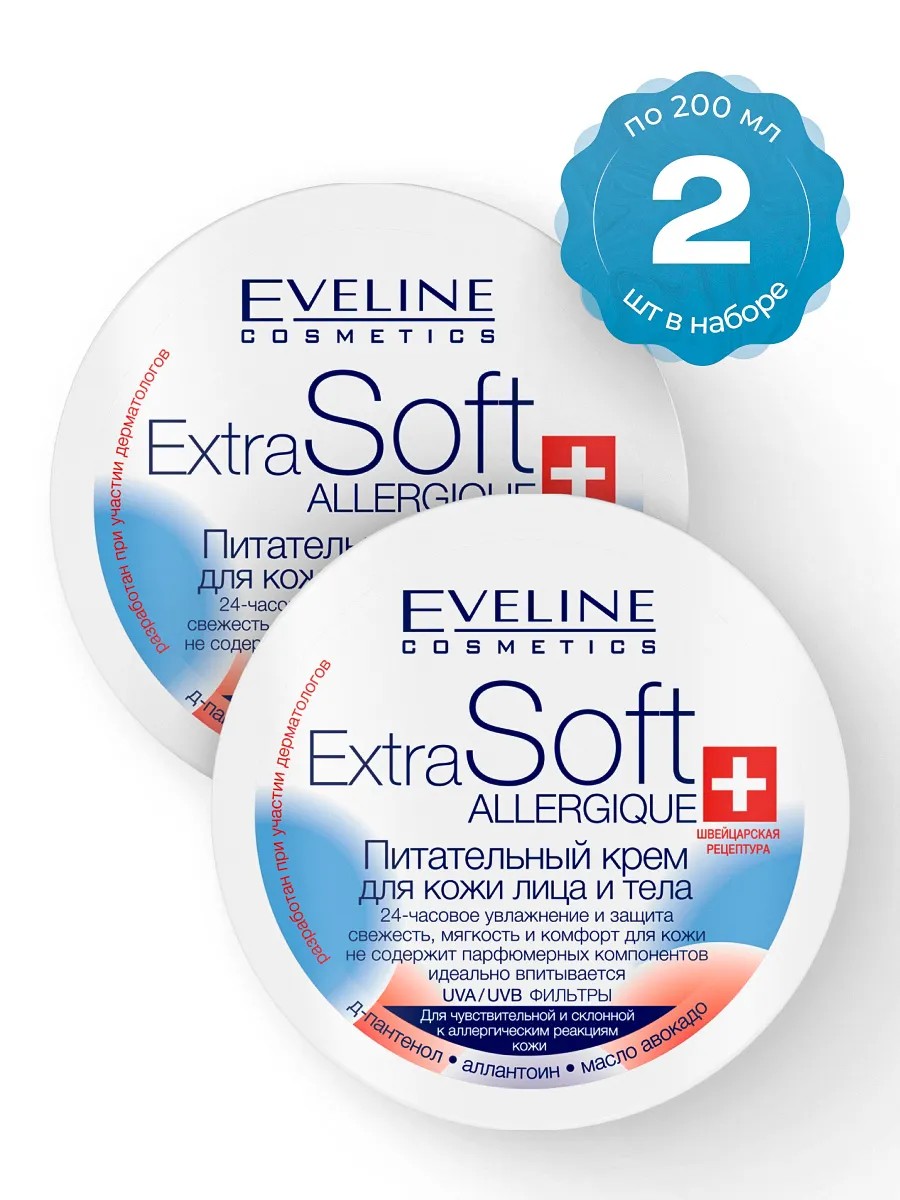 В наборе 2 крема по 200 мл. каждый. Питательный крем для кожи лица и тела Extra Soft Allergique от Eveline Cosmetics — это универсальное средство, разработанное по швейцарским рецептурам специально для чувствительной и склонной к аллергическим реакциям кожи. Обеспечивает 24-часовое увлажнение и надежную защиту, даря ощущение свежести, мягкости и комфорта. Масло авокадо в составе действует как натуральный липид, защищая кожу от пересушивания, потери влаги и способствуя её восстановлению. Мочевина превосходно увлажняет, смягчает и ускоряет регенерацию клеток. Д-пантенол и аллантоин нормализуют процессы восстановления, оказывают успокаивающее и противовоспалительное действие. Крем не содержит парфюмерных компонентов, быстро впитывается и не оставляет жирной пленки. Идеально подходит для ежедневного использования. Способ применения: ежедневно утром и вечером наносить легкими массажными движениями на кожу лица и тела.