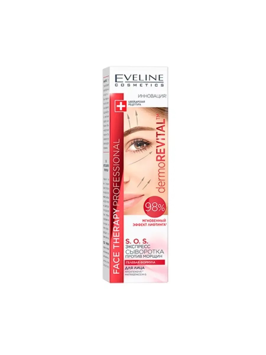 Eveline Сыворотка-экспресс для лица Face Therapy Prof против морщин S.O.S, 15 мл, 1 штука. S. O. S. Экспресс сыворотка, уменьшающая морщины под глазами, на лбу и вокруг губ эффективно сокращает «микроспазмы», ответственные за формирование мимических морщин, а применяемая регулярно - предотвращает их углубление и появление новых. Имеет в своем составе Neuroboostcomplex – инновационная, неинвазивная и безопасная альтернатива для ботокса.Подавляет секрецию нейромедиаторов, отвечающих за сокращение мышц, благодаря чему расслабляет их, предотвращая образование новых мимических морщин и эффективно разглаживает существующие.
