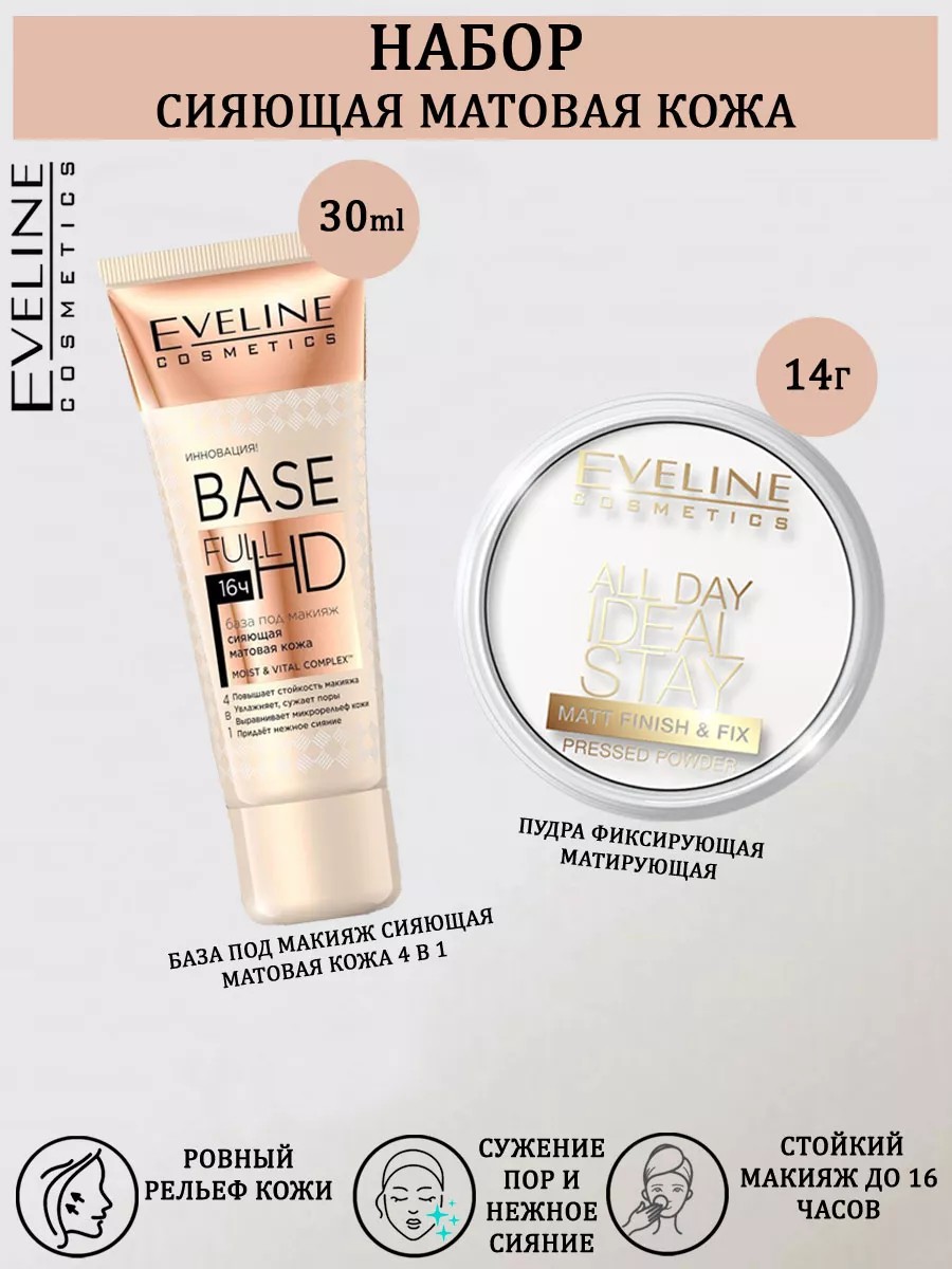Набор: База под макияж Сияющая матовая кожа BASE FULL HD 4в1, 30мл - обладает кремовой текстурой, содержащей осветляющие пигменты, которые придают эффект сияния и идеально выравнивают микрорельеф кожи. Эффективно сужает поры, скрывает несовершенства, нивелирует жирный блеск. Инновационный MOIST & VITAL COMPLEX увлажняет кожу и устраняет признаки усталости.