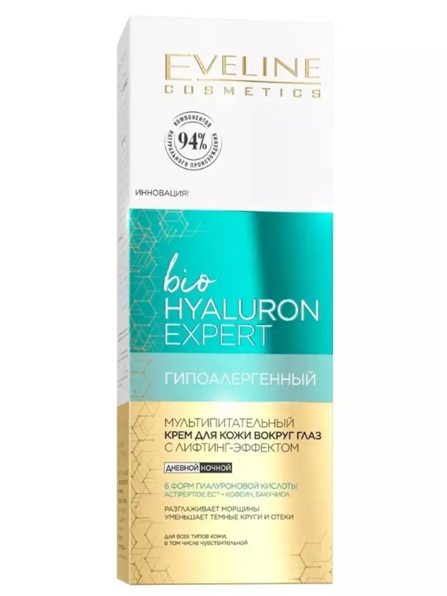The action of 6 forms of hyaluronic acid is supported by selected active ingredients: caffeine improves microcirculation, reduces the appearance of dark circles and puffiness. The innovative ACTIPEPTIDE EC complex effectively smoothes wrinkles and reduces crow's feet, firms the skin, and remodels the skin around the eyes. Bakuchiol stimulates active epidermal renewal, and Resveratrol has a strong antioxidant effect.