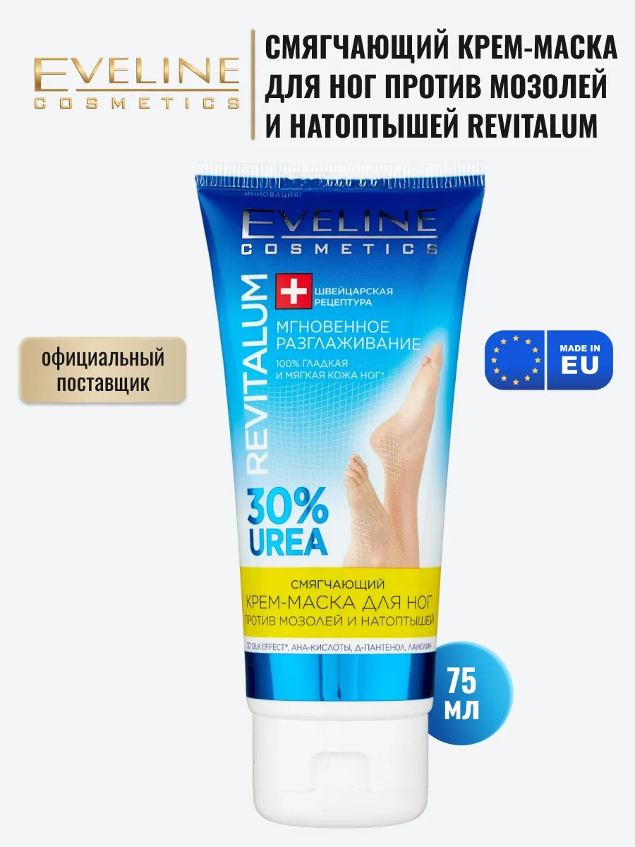 Инновационная Швейцарская рецептура крема-маски для ног, основанная на отшелушивающем действии AHA-кислот, концентрированном питательном 30% UREA и разглаживающем ланолине, эффективно борется с мозолями и натоптышами. Благодаря тщательно подобранному составу, средство увлажняет, питает и защищает кожу, обеспечивая салонный уход в домашних условиях.